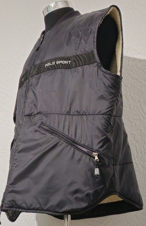 Local trades considered Vintage Polo Ralph Lauren sherling lined puffer vest in Mens Size XL Excellent used condition with minimal signs of wear - nothing noticeable - see pictures Please check measurements to ensure proper fit. Measurements: Pit to pit: 27 inches Length: 31 inches Shoulder across: 20 inches Sleeve (middle of neck to shoulder then to end of sleeve): Item will ship within 24 hours of payment made 👍🏻 A.i. description below: This vintage Polo Sport puffer vest from Ralph Lauren is a stylish addition to any wardrobe. Made with a softshell fabric type and insulated with polyester, it is lightweight yet warm. The black solid pattern and logo accents give it a classic, preppy look, perfect for outdoor activities or everyday wear. With zipped pockets and a full zip closure, this vest is practical as well as fashionable. It is a size XL and fits regular size types. The vest is a part of the First Ascent product line and was made in Bangladesh. Whether you're dressing up for work or dressing down for a casual day out, this Polo Sport puffer vest is the perfect choice.