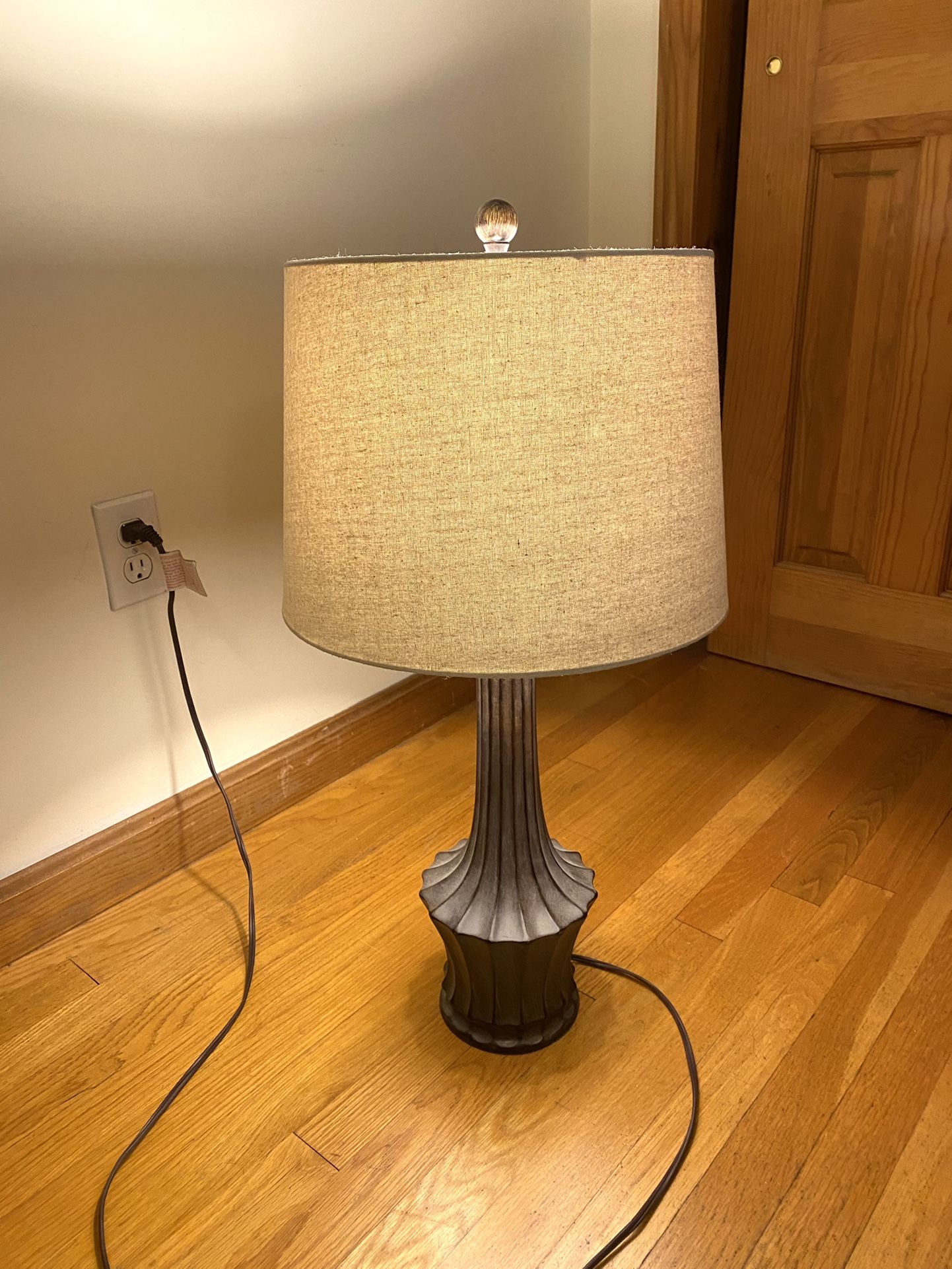 Beautiful barely used medium sized table lamp with brown handle, and white lamp shade. No flaws. Perfect for living room. Let me know if you have any questions!