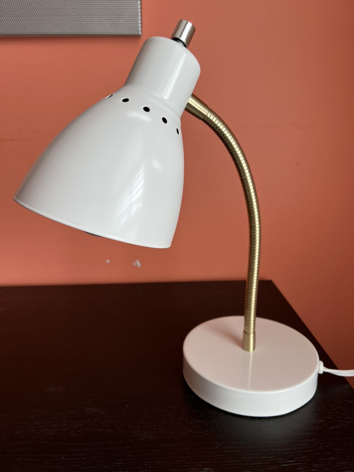 White desk lamp with gold flexible neck. Target brand.