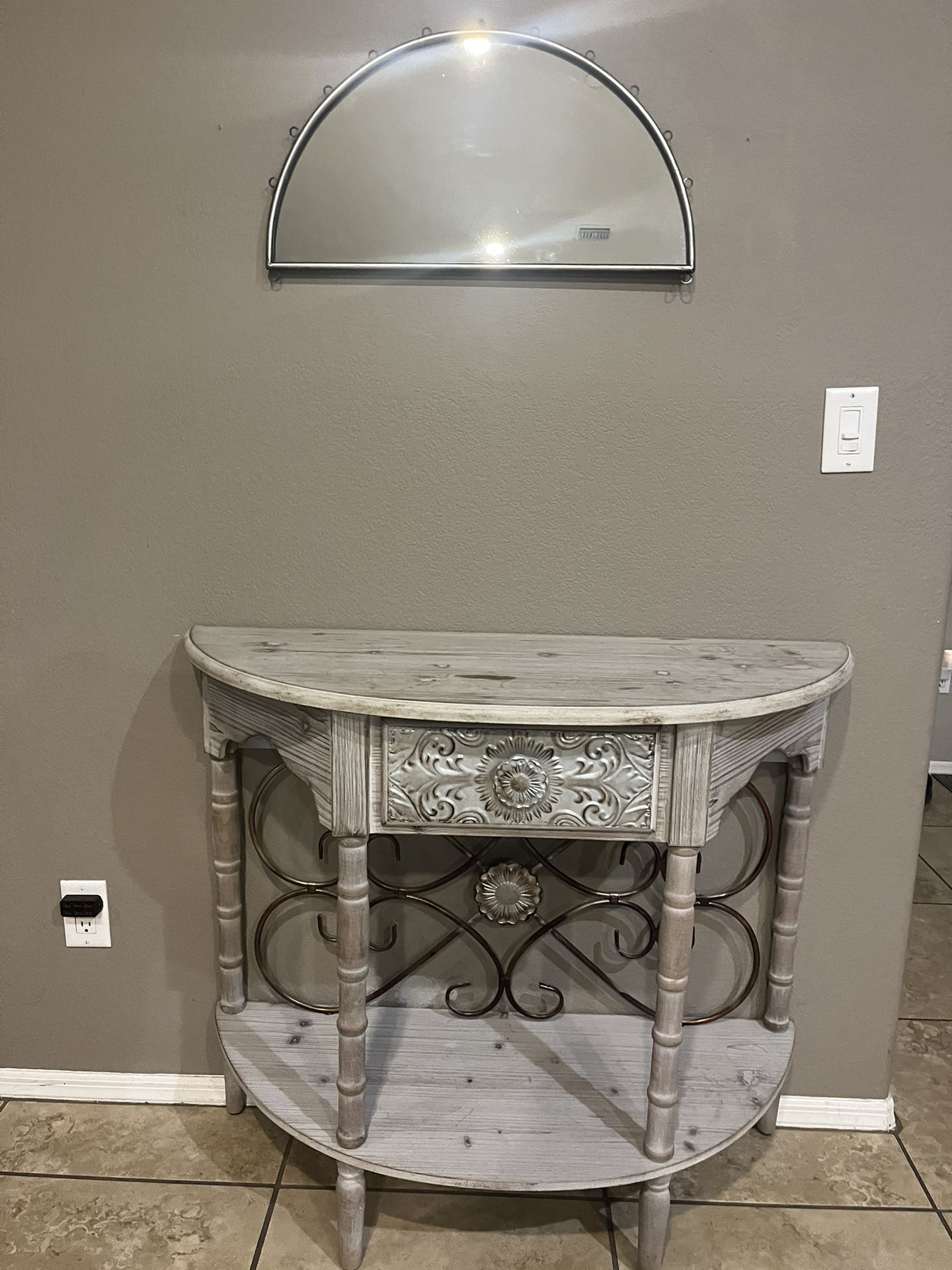 Antique wood half moon console table with drawer and shelf in excellent condition . The measurements are 39”Lx16” Wx33” H The mirror is 23”x12” Gray color with metal back decoration . Comes with gray half moon mirror 23”x12” All for $190
