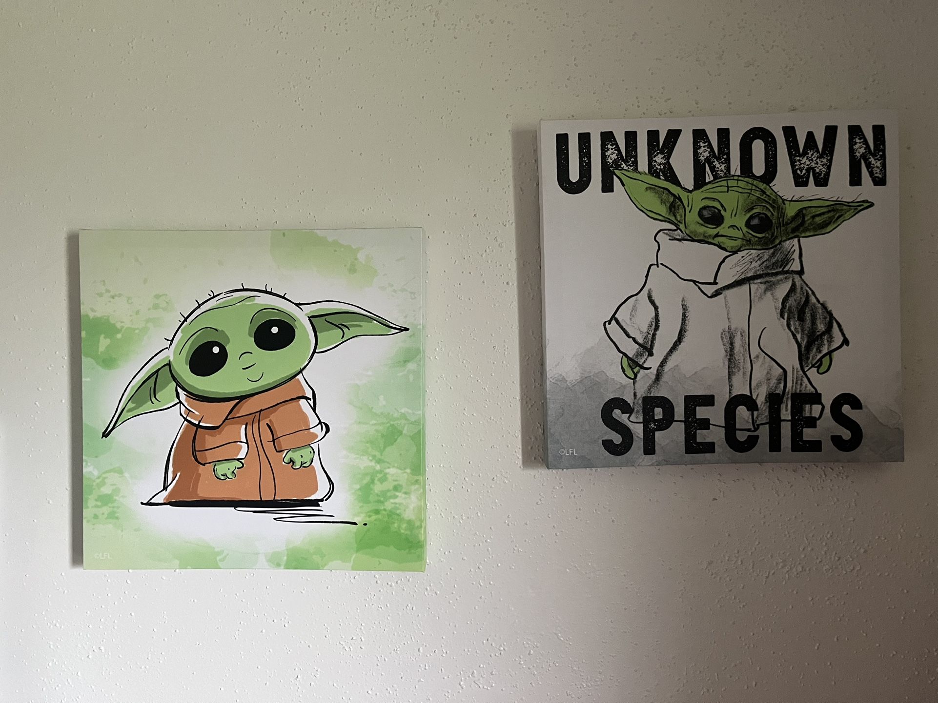 All baby Yoda themed pictures all painted/printed on canvas except one is a glass frame! In very good condition, I'm flexible on the price. I would like to sell them all together, but I will sell them individually.!! Please DM me if you are interested!
