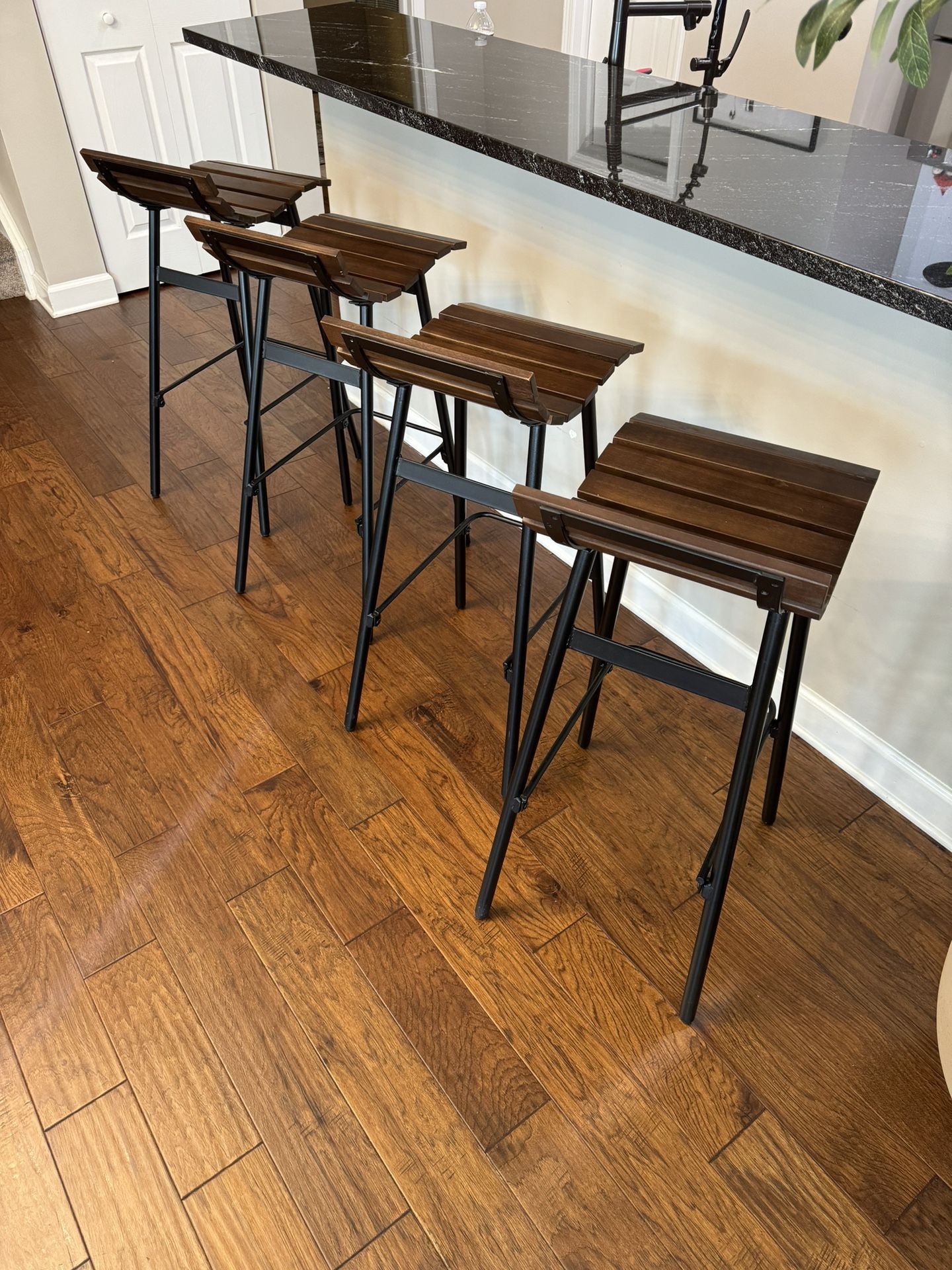 4 brand new wooden barn stools. Bar height. Seat height is 30 inches. 16.5 inches wide. Assembled and in perfect condition. Smoke free home. Price is for a set of 4.