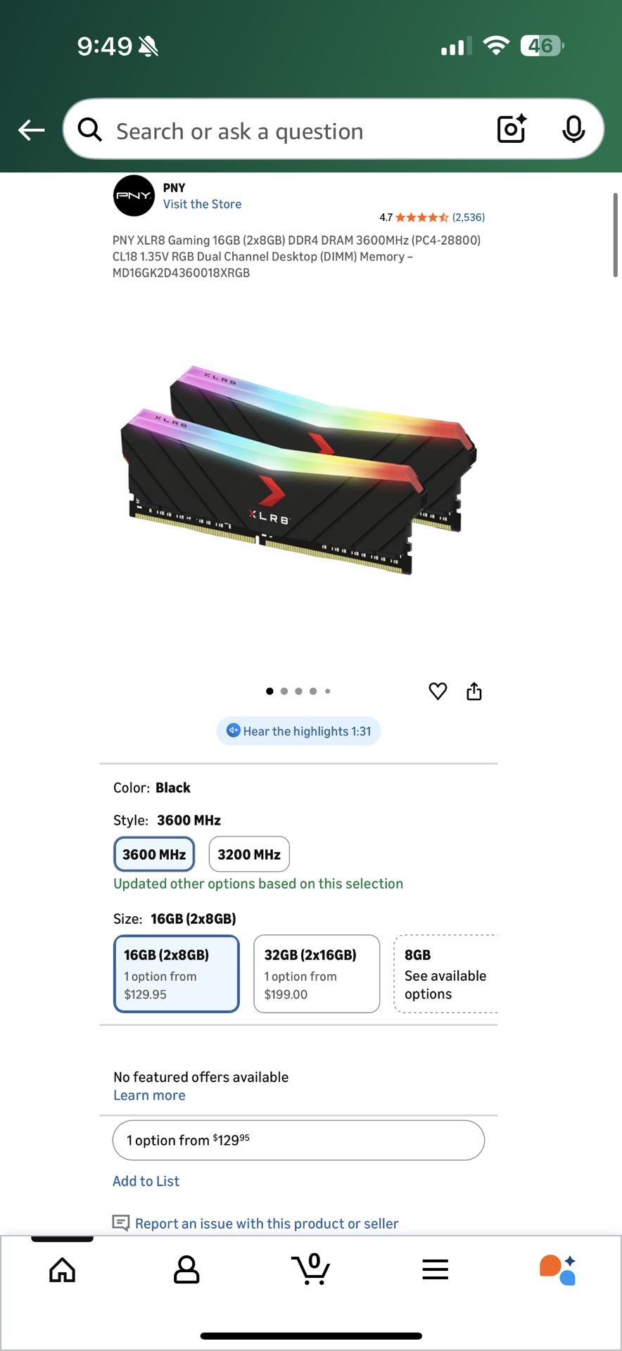 PNY XLR8 Gaming 16GB (2x8GB) DDR4 DRAM 3600MHz (PC4-28800) CL18 1.35V RGB Dual Channel Desktop (DIMM) Memory – MD16GK2D(contact info removed)XRGB