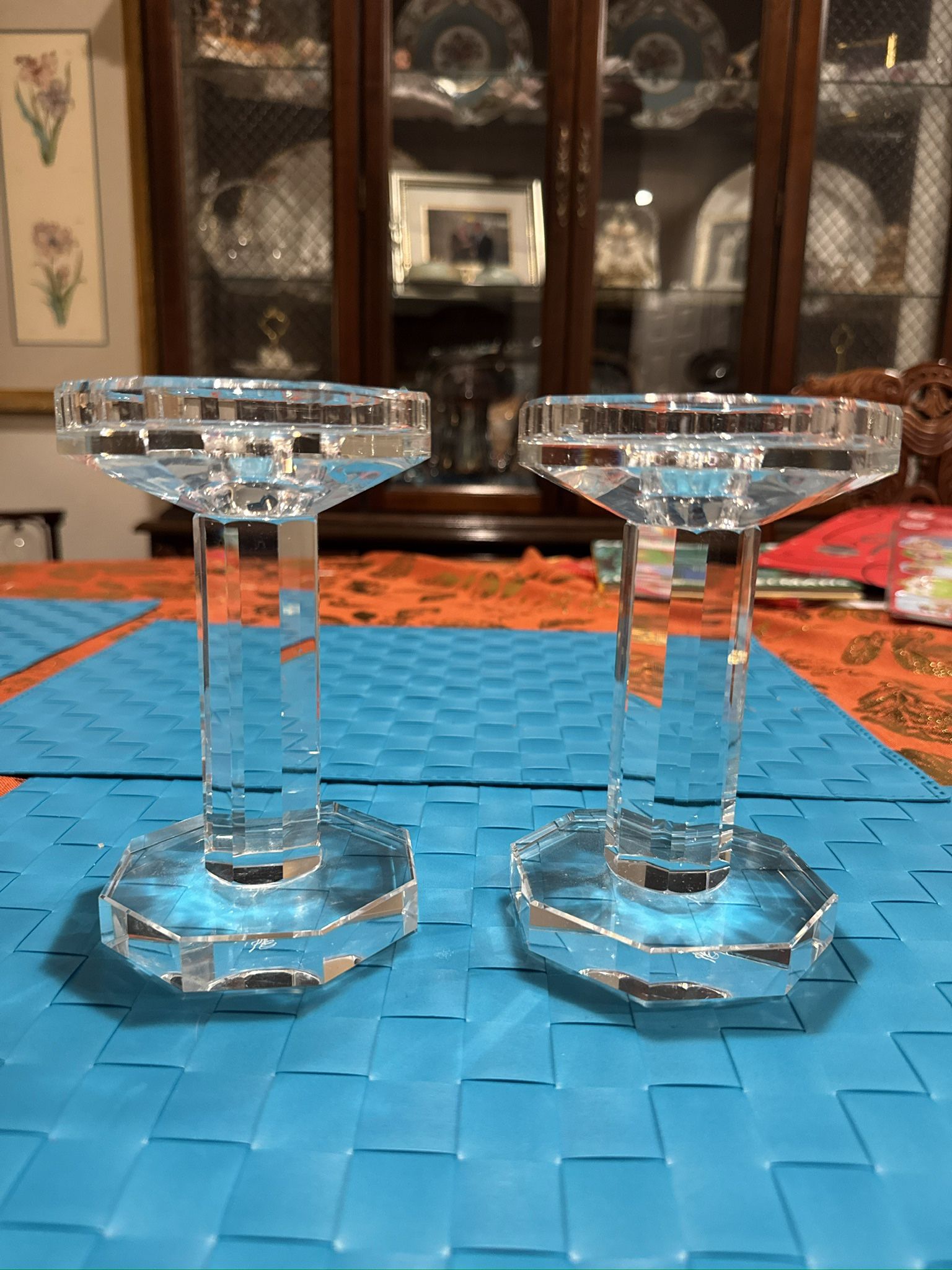 Beautiful clear crystal Oleg Cassini signed candlesticks. Looking at the picture showing the top of the candlestick and you can see it can be used for a taper or a 3” candle. They are in perfect condition. I apologize that my Russet colored Thanksgiving tablecloth is reflecting color like they are peach glass but they are transparent clear white crystal.