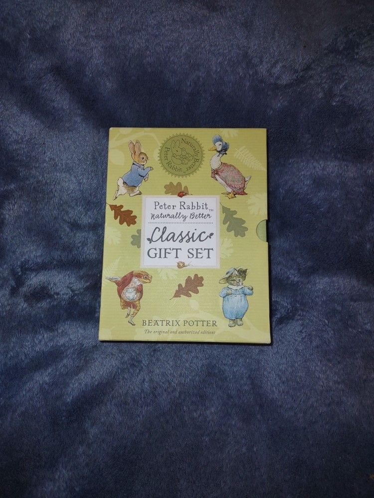 Peter rabbit naturally better classic gift set of 4 books in the case...A naturally better collection of classic children's tale 4 books in it's case ..."peter rabbit" naturally better us very rare to find anymore at this time ... he's brought some friends titles includes: perfect for holidays,baby showers, birthdays, or just for your collectors and so much more....these are brand new...these are eco-friendly boxed set includes four classic beatrix potter tales that meet ..."naturally better" criteria and showcase their "green" appeal, with the eye- catching vine cover design . The pages are in great great brand new condition...no rips,no tears, no writing in the pages .. nothing wrong with this beautiful book set .. ...The Tale of JEMIMA PUDDLE-DUCK .....The Tale of MR. JEREMY FISHER .....The Tale of PETER RABBIT .....The Tale of TOM KITTEN