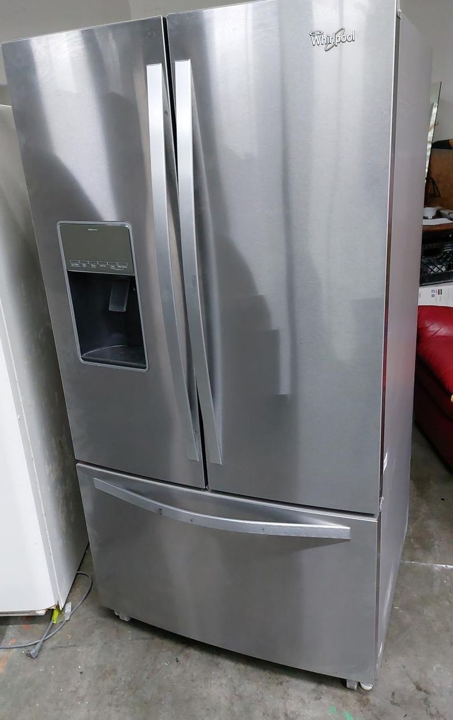 Exterior has minor surface scratches but overall looks clean and well-maintained. Interior shelves and compartments are spotless and free from residue, indicating gentle use. The Whirlpool 3-Door French Door Fridge offers a spacious and organized storage solution with a sleek design. Key features include a built-in ice maker and water dispenser, along with EnergyStar efficiency and LED lighting for visibility. Perfect for modern kitchens, the stainless steel finish provides a sleek, clean look. Comes with 60-day warranty. Same day delivery available. DM / Message us for more info. Hablamos español