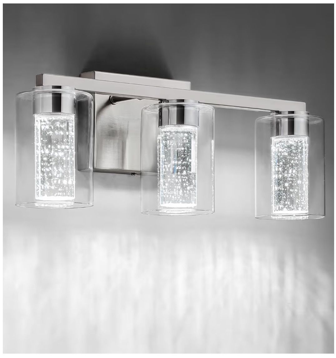 ➤[Unique Design] The vanity light is made with brushed nickel metal, modern bubble cylindrical crystals and round clear glass covers, which will add a touch of glamour and sophistication to your bathroom. And you can install the fixture with bulbs facing up or down, depending on your style preference. ➤[3 Color Temperature Options] You can control which color temperature your lights are and the overall ambiance of the room. 6500k is necessary for makeup application or shaving, but an evening bath will be more relaxing with 3000k or 4000k. ➤[Dimmable Lighting] It’s fully dimmable with a compatible dimmer switch to meet your demands for specific brightness at anytime, quite convenient for daily use. (Dimmer Switch not Included) ➤[High Quality LED Chips] There's no need to worry about having to replace the lights any time soon, as the lifespan of the bulbs is estimated to be 54,000 hours. It will light up your space while keeping electricity costs to a minimum.