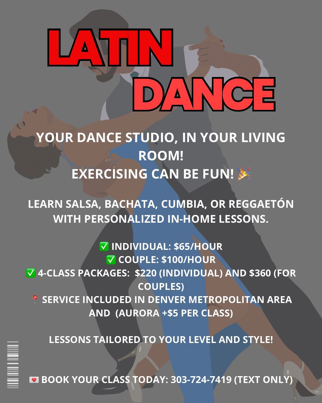YOUR DANCE STUDIO, IN YOUR LIVING ROOM! EXERCISING CAN BE FUN! ๐ LEARN SALSA, BACHATA, CUMBIA, OR REGGAETรN WITH PERSONALIZED IN-HOME LESSONS. โ INDIVIDUAL: $65/HOUR โ COUPLE: $100/HOUR โ 4-CLASS PACKAGES: $220 (INDIVIDUAL) AND $360 (FOR COUPLES) ๐ SERVICE INCLUDED IN DENVER METROPOLITAN AREA AND (AURORA +$5 PER CLASS) LESSONS TAILORED TO YOUR LEVEL AND STYLE! ๐ BOOK YOUR CLASS TODAY: (contact info removed) (TEXT ONLY)