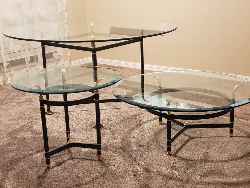 Glass table tops are a fantastic option for homeowners. Glass tables are easy to clean, simple to maintain and make small spaces feel larger and more open. Dining room table measures 54 inches round by 28 inches high. Coffee table measures 38 inches round by 15 inches high. End table measures 26 inches round by 21 inches high.