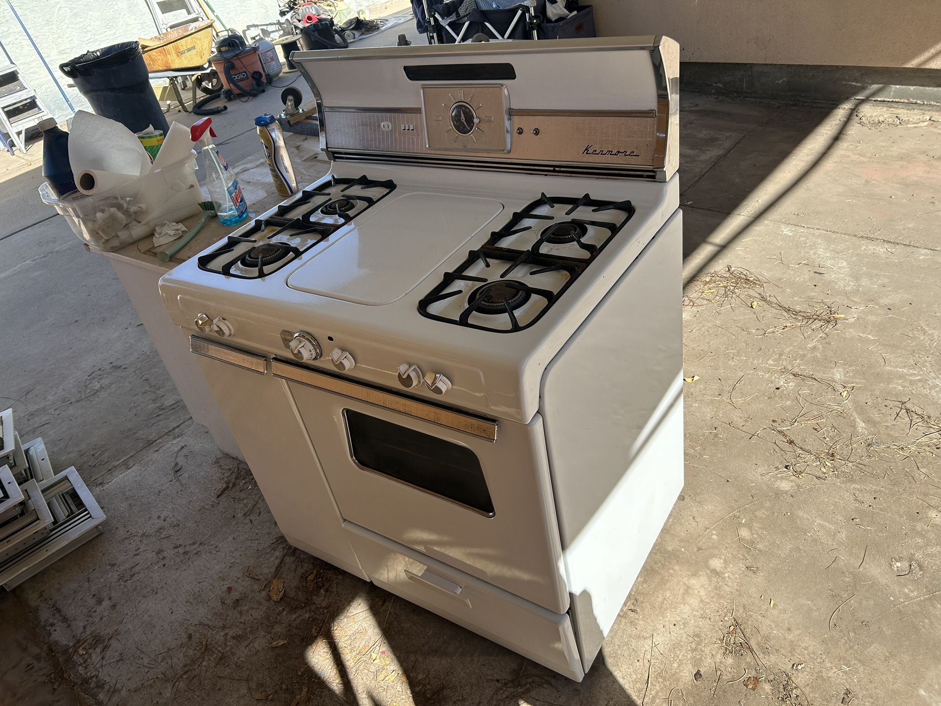 Vintage Range Oven Stove Kenmore Sears Roper White Not sure of age but likely 1950’s (see pic of model # to research) Kenmore White vintage gas range with 4 burners & griddle. Comes with a lot of accessories (see pic), I think they are the original vintage set of accessories. Such as griddle, rotisserie, warming door pans, braising pans, glass protector pads, etc. I cleaned it up a bit, but it could use anotger good cleaning. Some of the plastic knobs are a bit broken but could be fixed. A few scratches but it still looks great. As far as I know all burners & oven light & work good. Asking $350 obo, make me an offer Located at 15th ave & mcdowell You haul, no delivery.