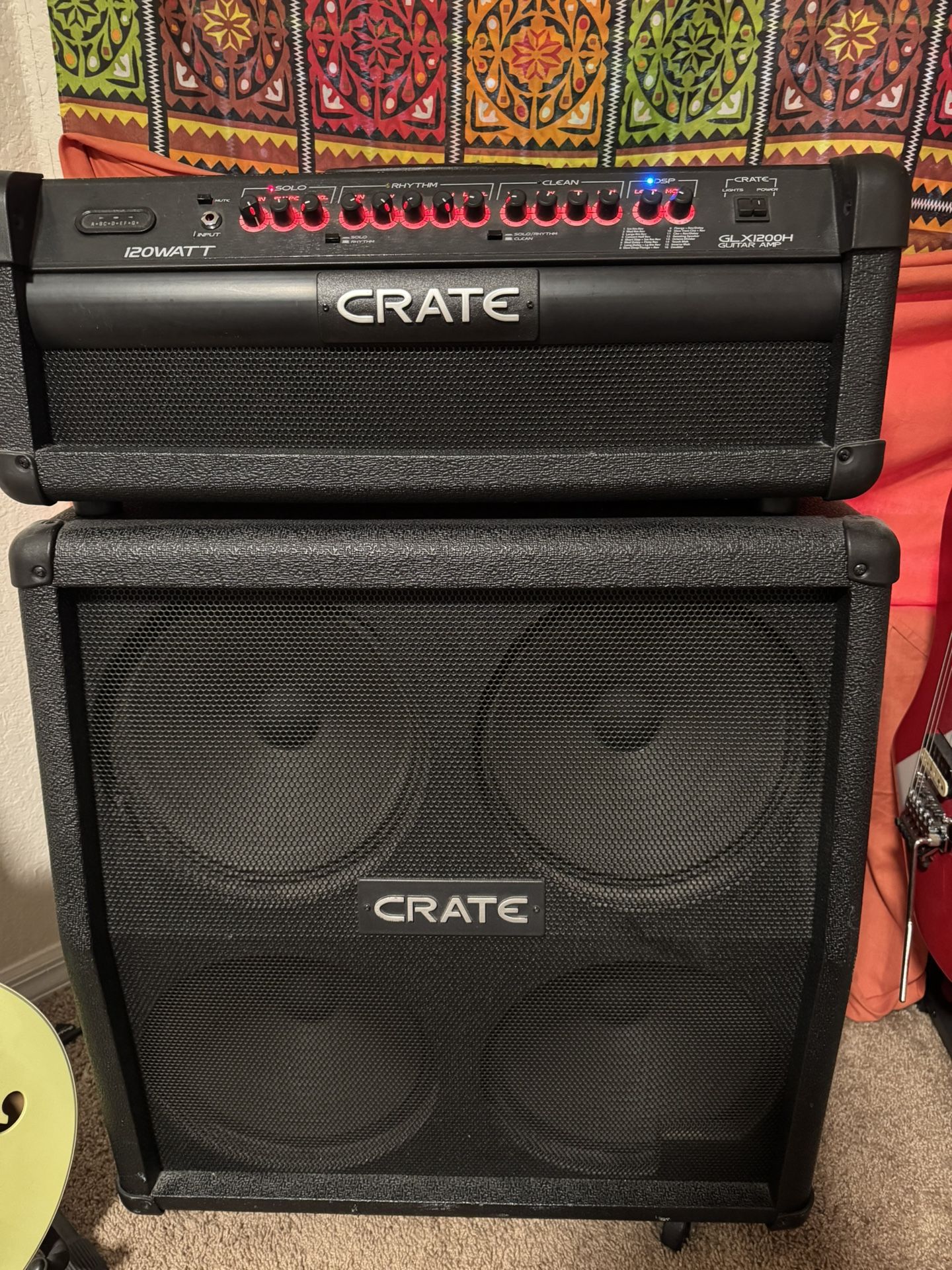 Crate GLX1200H 100W Half-Stack Package The Crate GLX1200H 100W Half-Stack Package features 120W RMS power, FlexWave Evolution 5 preamp, 3 discrete channels with independent level and EQ controls, and 16 DSP effects with channel tracking. Connections include an effects loop, external speaker jack, and footswitch jack for included CFS3 footswitch. Other nice features: an angled, backlit control panel; built-in chromatic tuner with mute switch; and a heavy-duty handle. The lightweight cab is a compact 4×12 box, perfect for use under the GLX1200 head. It features 100W RMS handling, heavy-duty construction with a metal grille, and 4 special-design Crate speakers. Dual 1/4″ input jacks. 27″W x 27″H x 14″D. 54 lbs.