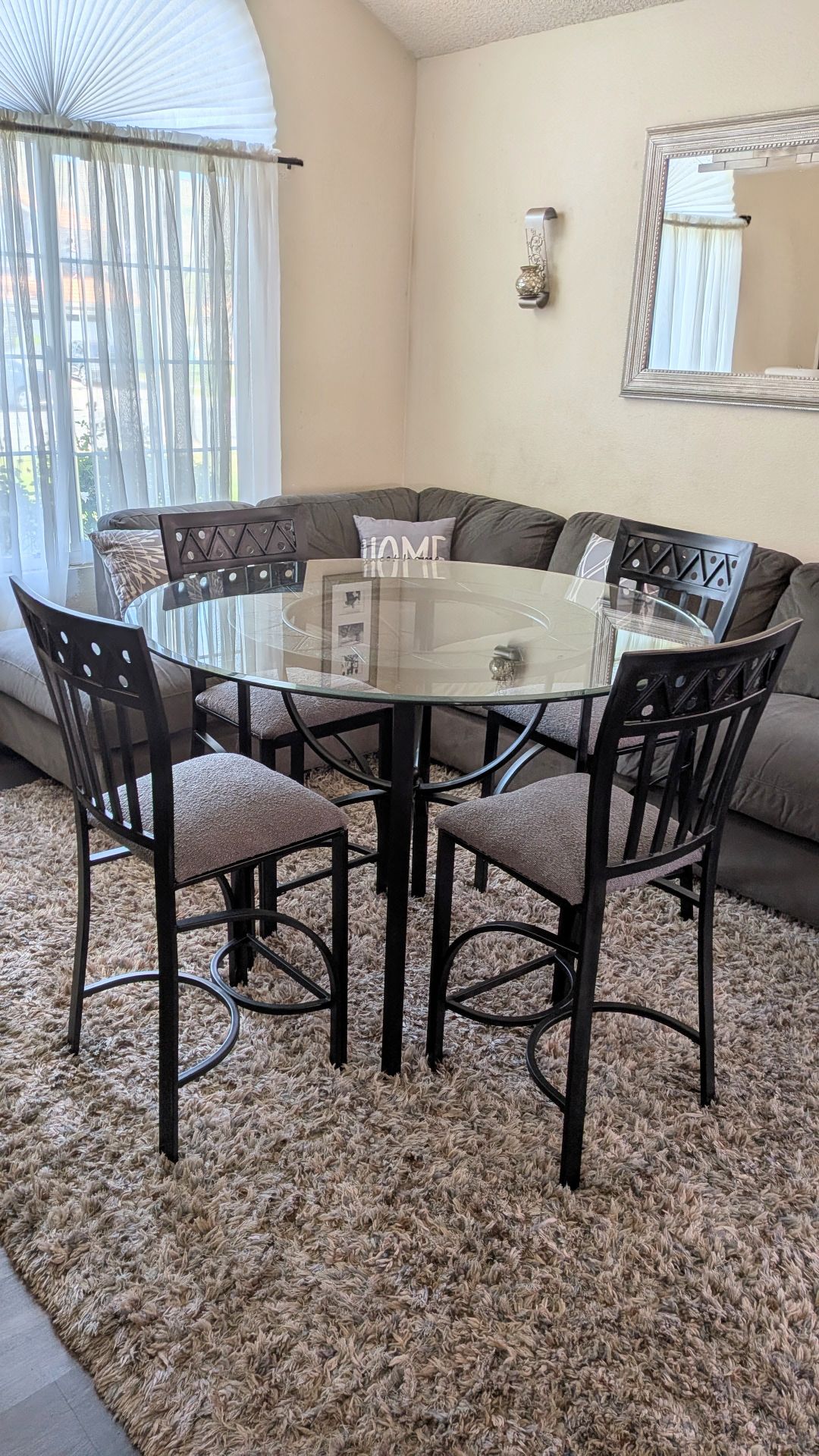 THIS COUNTER HIGH PATIO/ DINING TABLE TABLE IS IN EXCELLENT CONDITION. CLEAN, VERY SOLID AND STURDY. HAS THIS BEVELED EDGE GLASS AND 4 COUNTER HIGH SOLID CHAIRS. CHAIRS ARE FIRM , GREY DURABLE UPHOLSTERY NO RIPS, NO STAINS, CLEAN. HEAVY, COATED DURABLE METAL DESIGN. IT MEASURES 48" ROUND, 35" TALL. CHAIRS ARE 24" TALL FROM FLOOR TO SEAT. THIS TABLE CAN BE USED INDOORS OR OUT. ONLY ASKING $125 FIRM. PRICE IS NOT NEGOTIABLE. SERIOUS BUYERS ONLY PLEASE. SORRY NO HOLDS FIRST COME BASIS. ABSOLUTELY NO LOW BALLERS PLEASE!!!