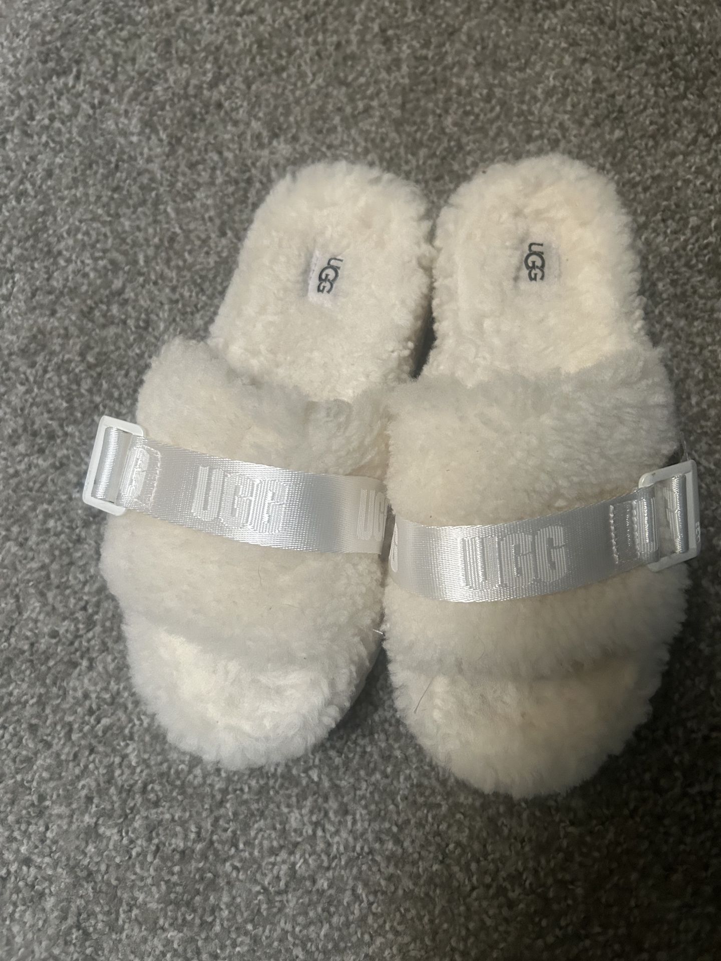 these are the UGG Women's Fluffita Slide Sandals. They are a hybrid style that combines a slipper and a sandal, featuring a curly sheepskin upper and lining for a cozy feel. Size 8. Never worn. 20.00