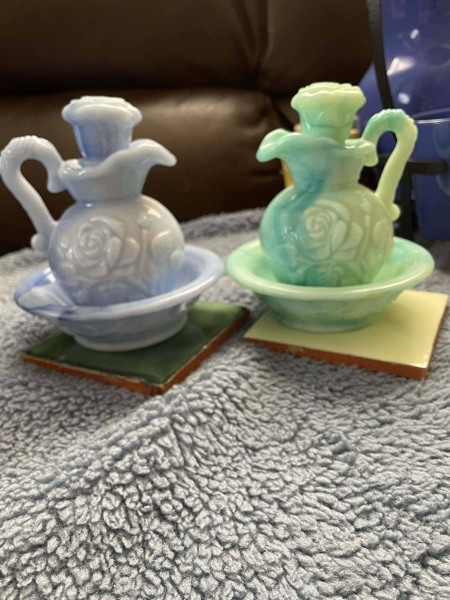 If you buy Both sets, it’s $25 total If you want one set, it’s $15 a . These are made of milk glass in the colors of mint green and light blue.