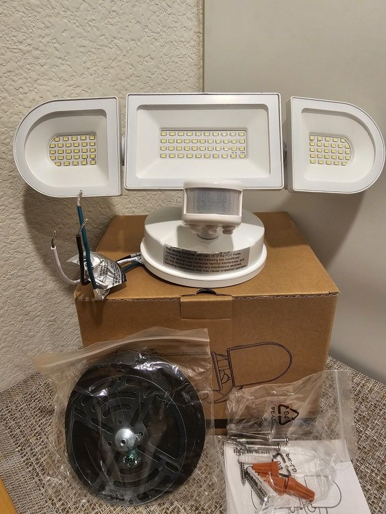 Brand new. Price is Firm. 4600LM Bright LED Security Lights Motion Sensor,6500K LED Flood Lights Outdoor,3 Head Adjustable IP65 Security Lights Motion Detection Outdoor for Yard. The sensitive Motion Detection Outdoor Lights can be triggered by moving people, cars and pets. The sensing distance of this LED Motion Lights Outdoor up to 65.6ft away within a broad range of 180°. Flexible lighting time from 10s to 7mins, this Security Flood Light gives you longer-lasting lighting than other lamps.