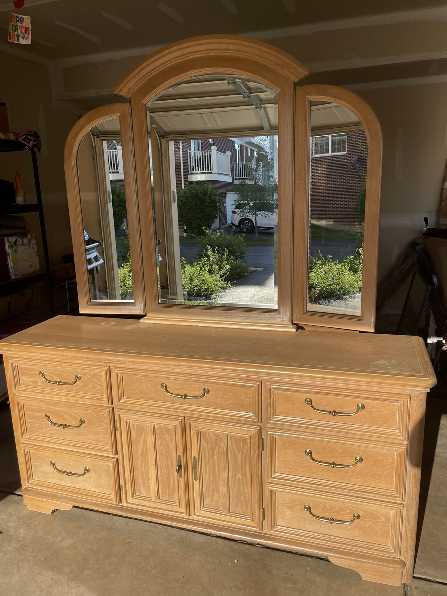 Bedroom set that includes long dresser with mirror and two night stands. Mirror can easier be detached. Normal wear and tear in areas (see photos) but lots of drawer space. Must have truck/large SUV for pick up Dimensions: Big dresser w mirror H 79 5/8” Big dresser without mirror H 32 1/8” W 70” Depth 18 1/8” Night stands H 24 1/8” W 28 1/8” Depth 16”