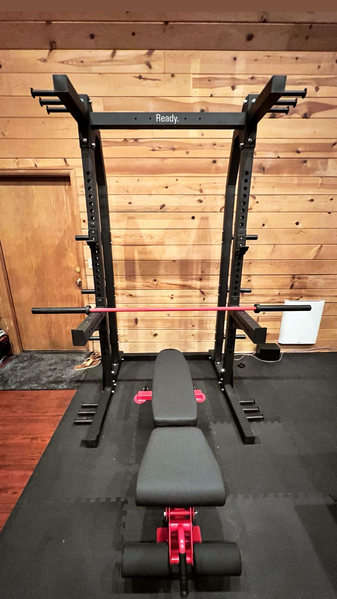 READY Power Rack w/ REP Fitness Bumper Plates + Adjustable Bench + Barbell (Black/Red)
