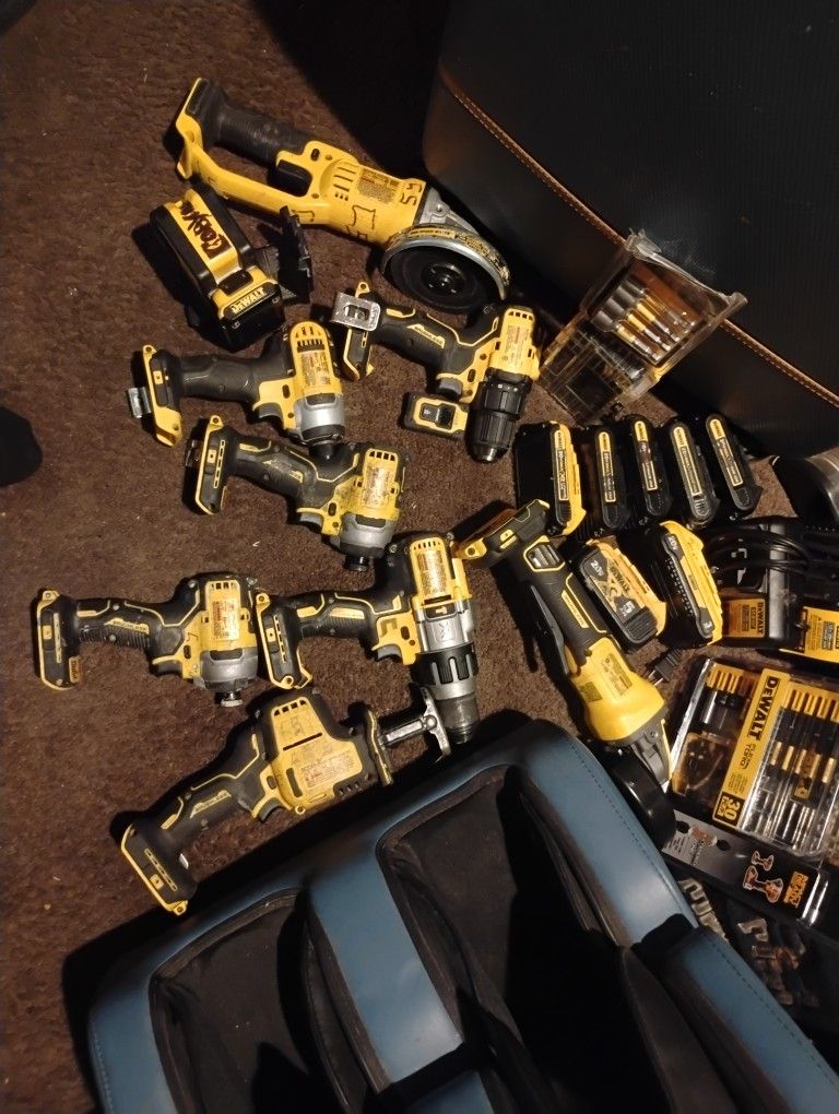 Good 9 piece DeWalt set plus seven batteries two chargers and the box would like to sell it all together if possible but we could part out just hit me up and we can make a deal