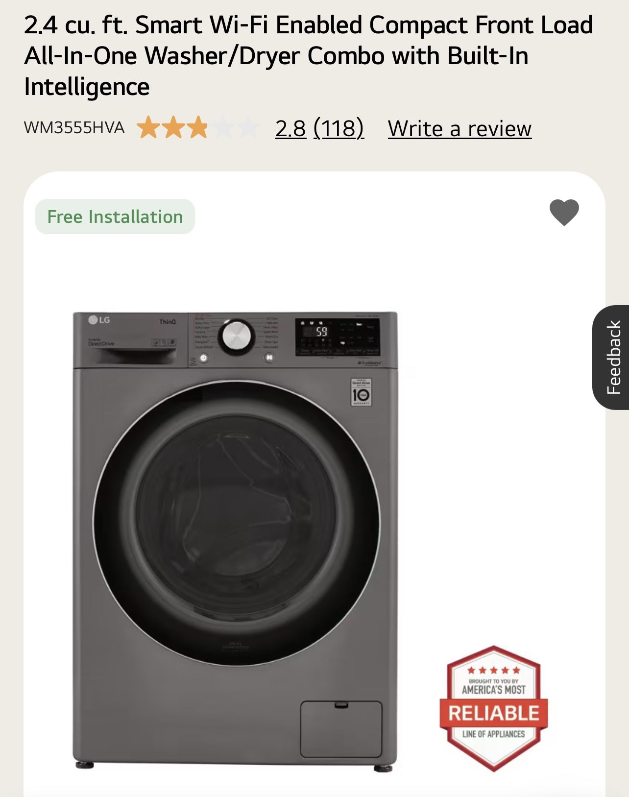 2.4 cu. ft. Smart Wi-Fi Enabled Compact Front Load All-In-One Washer/Dryer Combo with Built-In Intelligence. Serial Number: 410VWJHLH604 Model Number: WM3555HWA Originally $1,899. BRAND NEW. Unopened, in original box. OPEN TO NEGOTIATION.