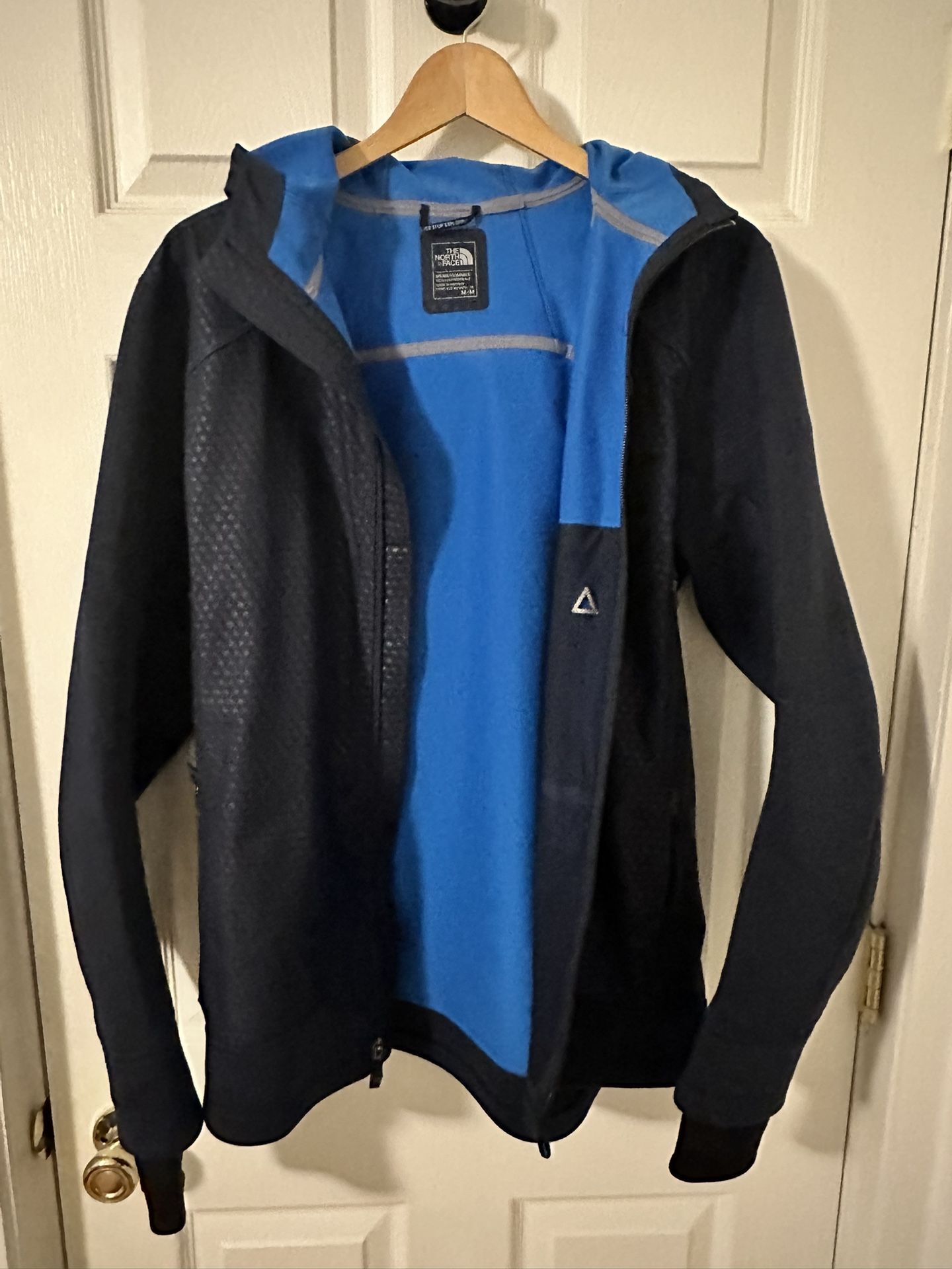 Lightweight, wind-resistant Apex hoodie from TNF – perfect midlayer for Chicago winters, windy commutes, or layering under a shell for spring/fall. Super breathable with laser-perforated pattern (those dots let air flow while blocking wind), stretchy fabric, cozy brushed interior, and contrast blue hood liner for style. Features: • Full zip with hood • WindWall tech (blocks wind, light DWR for drizzle) • Perforated body for ventilation (no overheating during activity) • Raglan sleeves for mobility • Stretchy cuffs/hem • “Never Stop Exploring” tag + TNF branding $45 obo