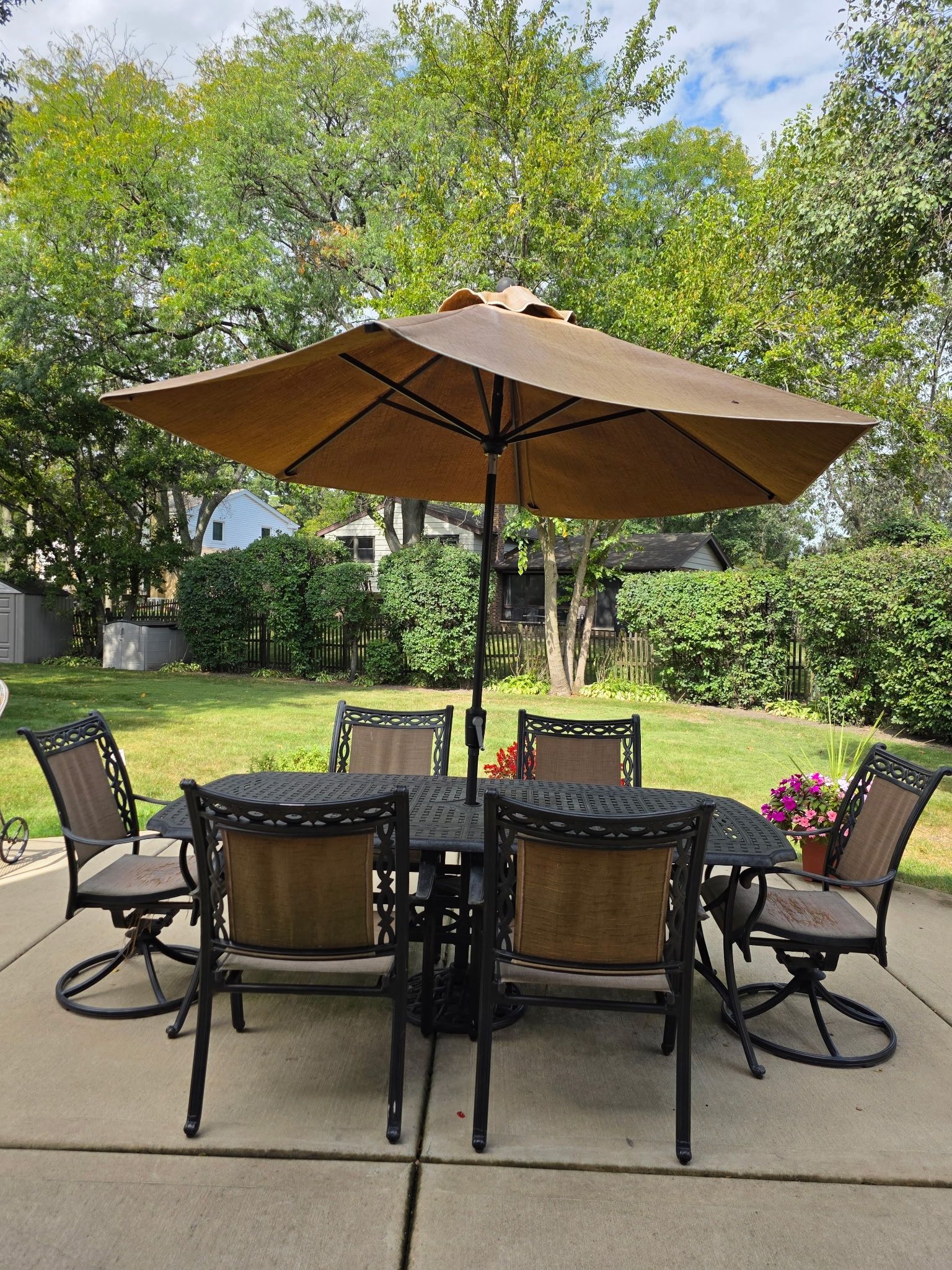 Outdoor patio dining set Metal sturdy well made Used condition shows signs of use and wear Table 42”x 84” Lattice tabletop 4 chairs and 2 swivel chairs some chairs need to replace cloth Umbrella good condition functional Glenview pickup