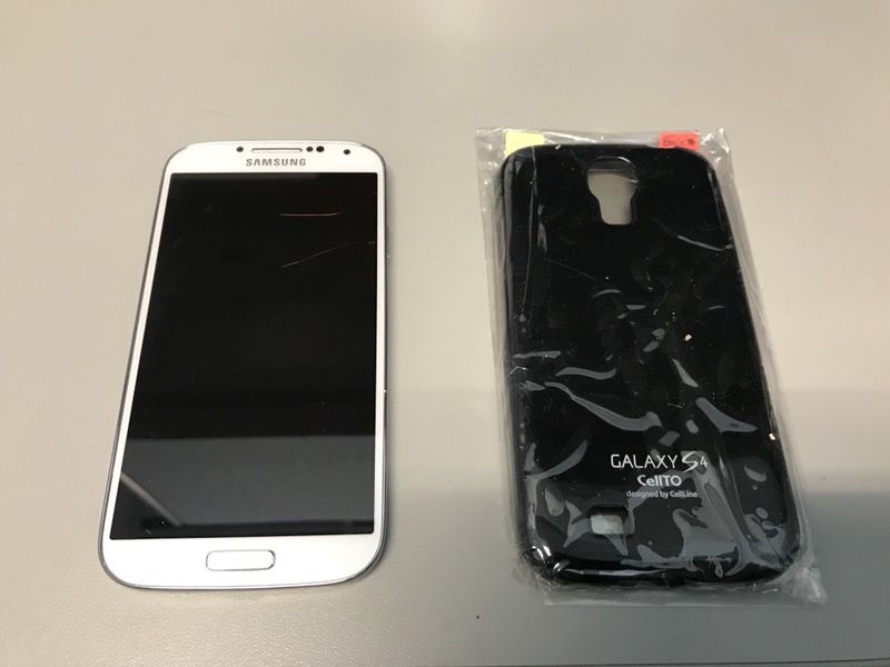Samsung Galaxy S4 with Case. Screen is dead but can be replaced rather cheap. Other than screen everything works.