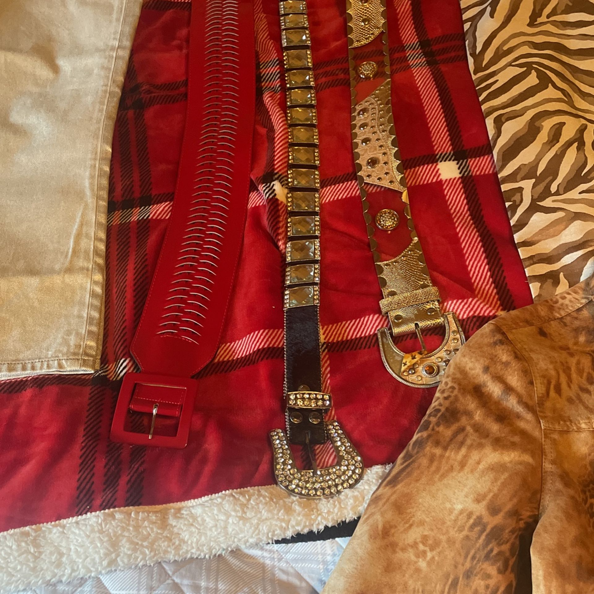 Belts $25 Pants $20 Jacket $30 Zebra printed jacket $30