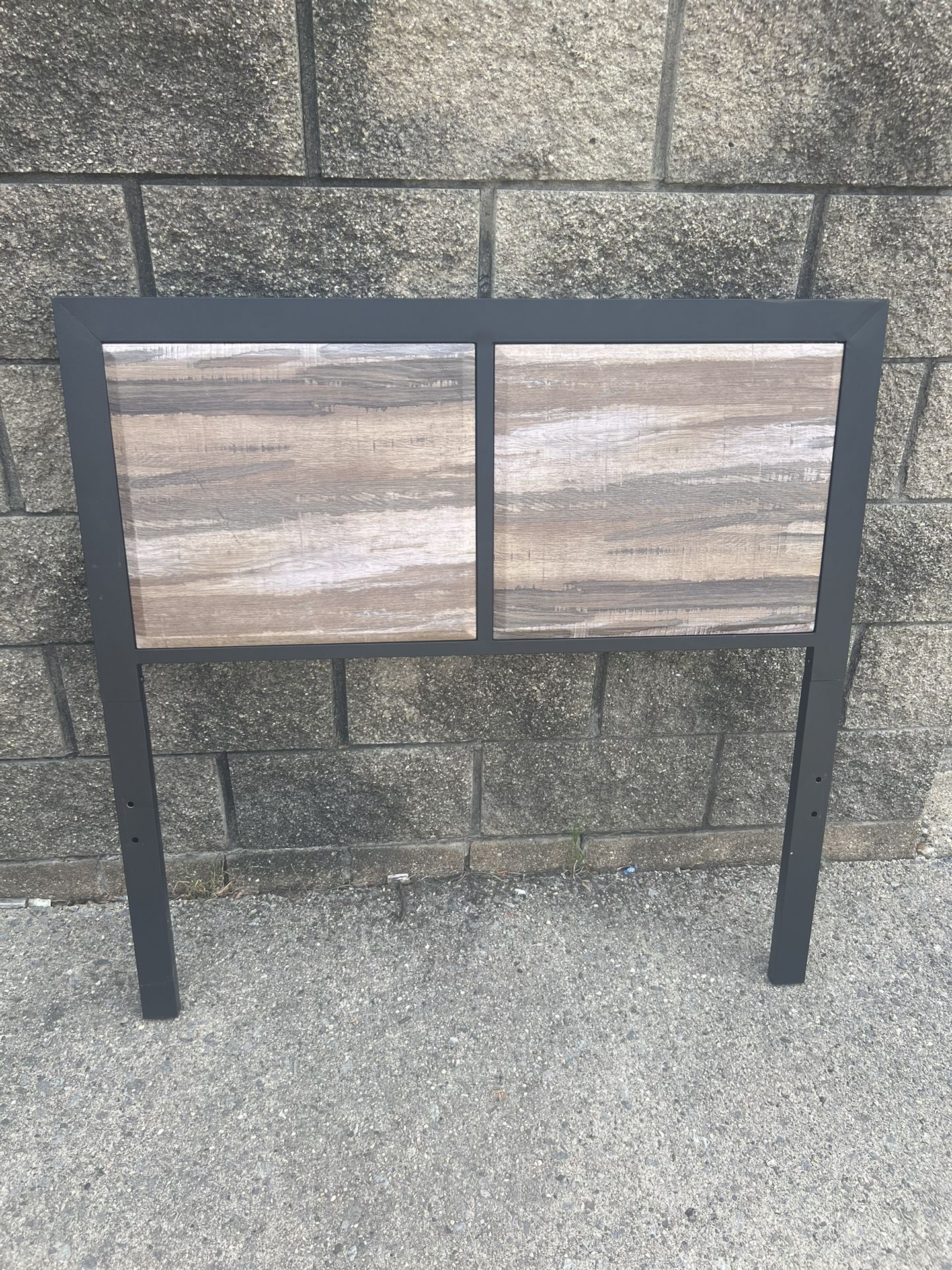 TWIN size headboard…..very good condition and features metal frame along with weathered wood backing. You will need to drill holes and attach a bed frame to this piece! Measurements are 39 3/4” wide and 39 1/2” tall. POOS