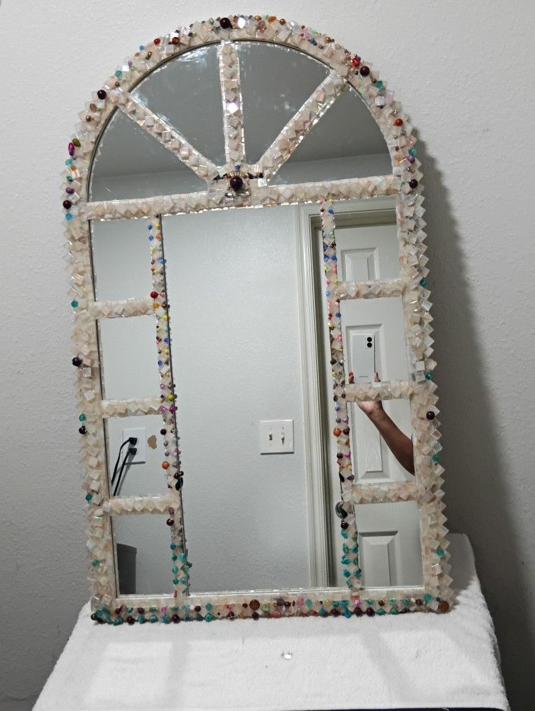 Hand made repurposed arched vintage mirror framed with mosaic tiles and precious gemstones