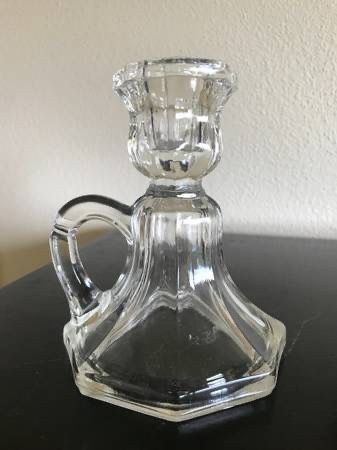 Heavy weight vintage pressed glass candle holder with sculpted octagonal base and eared handle. Size is 5" tall and in excellent condition.
