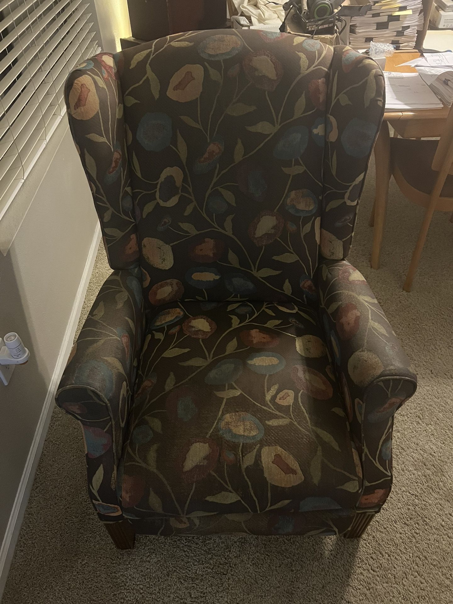 Upholstery is getting thin towards the front of chair. Comfortable, well loved chair.
