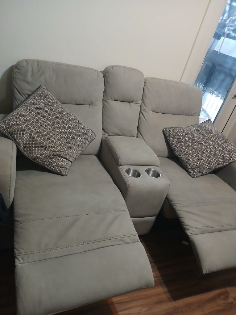 Less than a yr old. Power reclining sofa set. Needs new home and a little tlc. Still lots of life in them, no droops or caving. Have built in USB connector and wall plugs. Let's make a deal