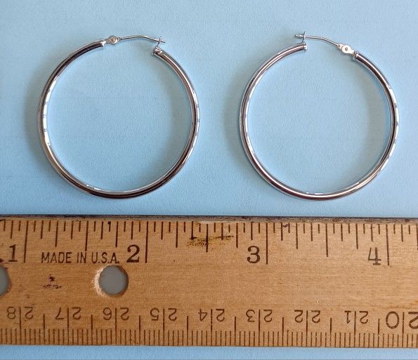 Sterling Silver hoop earrings, approximately 1 & 3/8" in diameter. Latch-back clasp Excellent condition. Cash only, will meet locally within reason. I will remove post when sold.