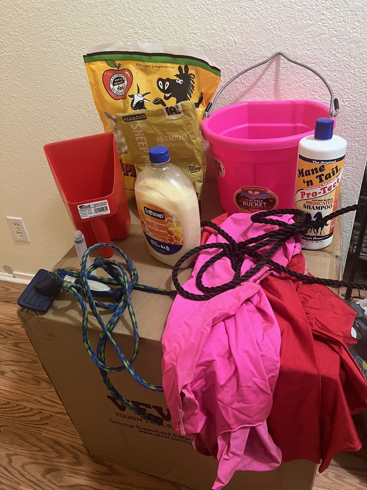 My daughter no longer has her lamb. Selling 2 harnesses, flat back bucket, 3 qrt scoop ,shampoo is 1/2 full, minerals about 1/4 of the bag left, 2 tubes, feeding syringe, milk and honey soap, and brush.