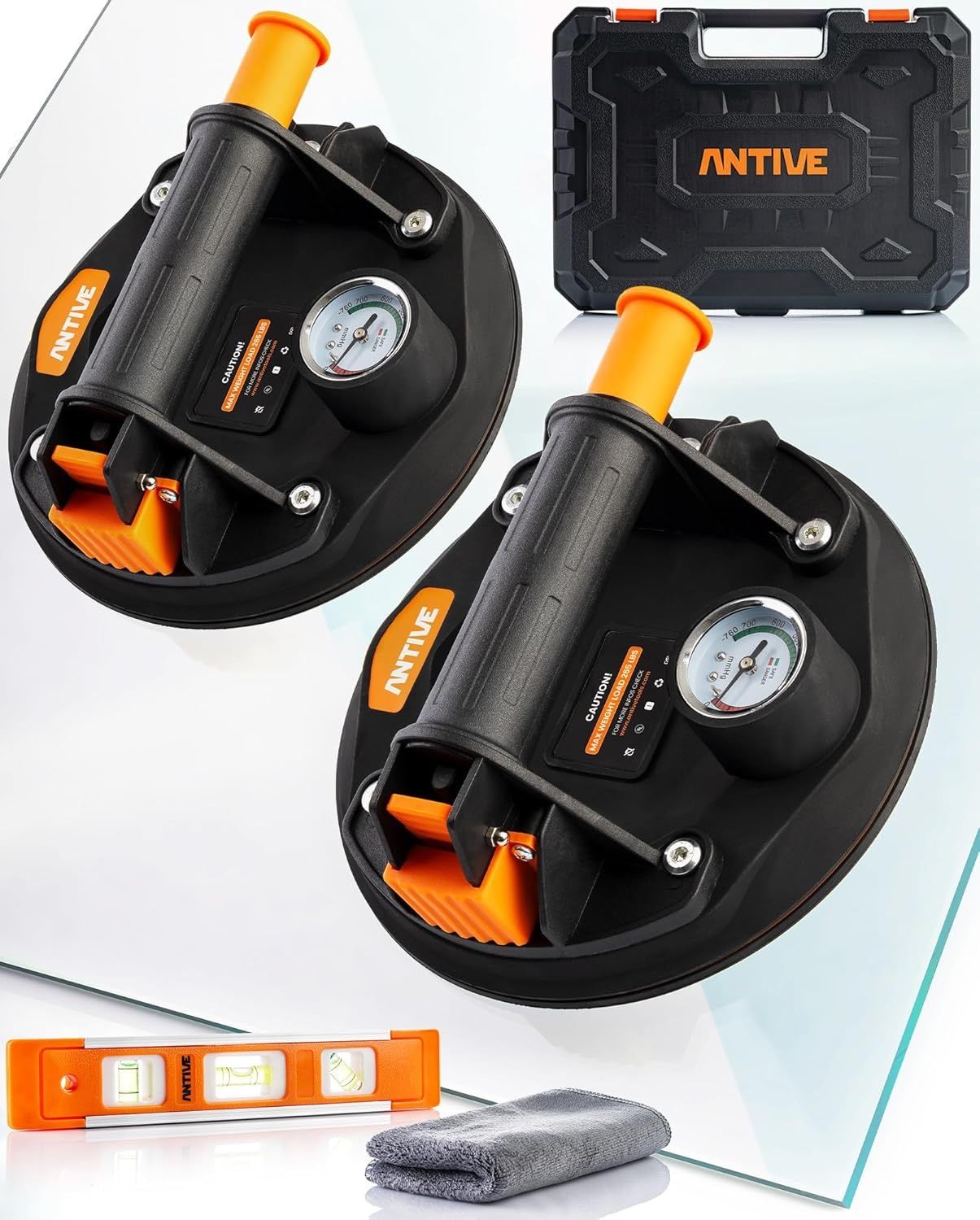 This product is brand new and offered at between 45% - 75% off the current selling price on Amazon. WeI receive these products for free in order to create video reviews for the company. Then we sell them at a significant discount to our customers as we price them to sell fast. So hurry as deals like these usually do not last long! Strong suction load up to 265 lbs. per cup — Lift big, move safe with our set of two 8" suction cups for windows. Designed for pros and demanding jobs, this set of suction cup lifter delivers industrial-strength performance right in your hands. Monitor grips at all times — No more guessing! This vacuum suction cup handles for lifting features a barometer safety check, ensuring your tile suction cup tool operates at the correct pressure, making it a dependable 8" glass lifting tool for both home and on-site use. Up to 6 Hours of vacuum hold — Our Antive heavy duty window suction cups for glass deliver a vacuum hold that lasts. The durable glass suction handle grips up to 6 hours. Check the barometer to be in the Green zone before you lift. Secured grip for non-porous surfaces — Whether you need a suction cup for glass, tile suction cups, or a polished granite suction cup, our moving suction cups give you a strong hold on any flat, non-porous surface, making our Antive suction cups for tile installation the most versatile set! All-inclusive toolkit for glass handling — Get your vacuum suction cups heavy duty, vacuum suction cup glass lifter, and suction cups for moving glass, all in a single kit. With suction cups industrial grade, magnetic level, and all included, no extras required to finish the job!