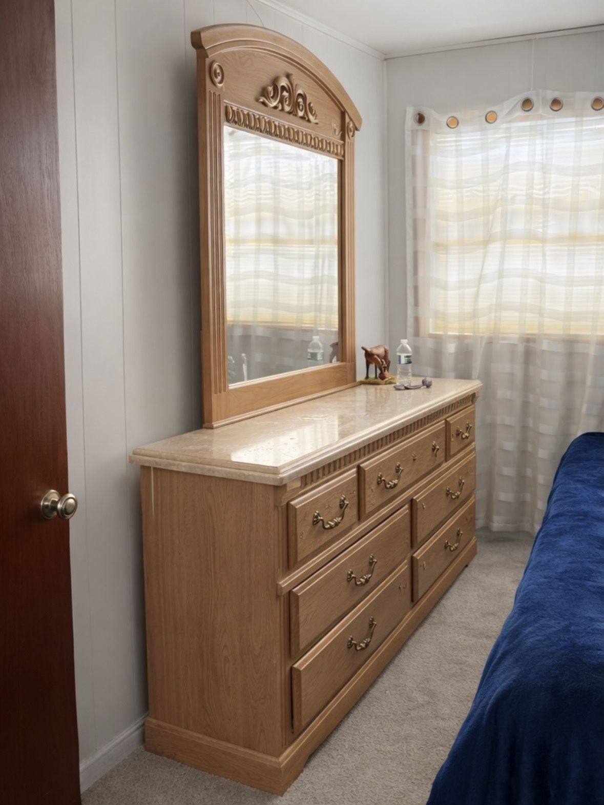Beautiful matching bedroom set in a warm oak finish. Includes a large dresser with attached mirror and a spacious armoire. Classic carved details with brass hardware and plenty of storage. Very sturdy and heavy—built to last. Normal cosmetic wear from use (small scuffs/scratches), nothing structural. Drawers and doors work well. Great for a guest room, main bedroom, or anyone who likes traditional furniture. ( pickup only- must be able to carry out of home on your own )