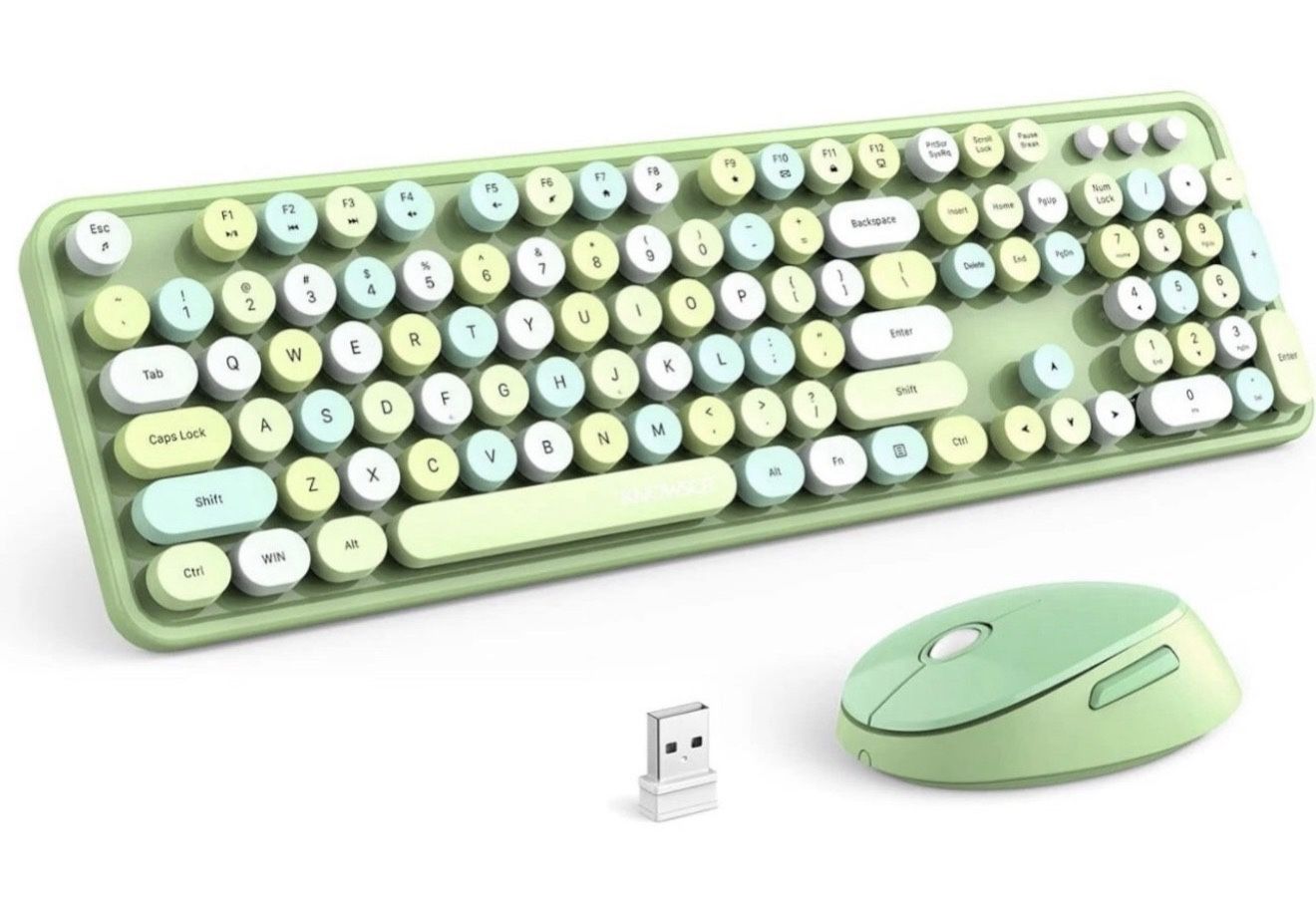 VAN NUYS AREA. MOFII Wireless Keyboard and Mouse Combo, 2.4GHz Retro Typewriter Keyboard and Cute Mouse for Computer PC Desktops Laptop Windows(Green Mix). Colorful Wireless Keyboard and Mouse - Gorgeous look design adds ambiance to your desktop, perfect for office or home workers and perfect for gift giving. Works with your PC, laptop, desktop, computer. 2.4G Wireless Connection - Provides a reliable and stable connection of up to 35 ft with no delays or dropouts, includes 1 USB receiver to connect keyboard and mouse at the same time, plug and play, no driver and software required, easy to use. Ergonomic Design - The wireless keyboard has a folding stand to keep it at an optimal slope, preventing wrist injuries when typing for long periods of time. The wireless mouse has a rounded silhouette that allows you to work comfortably for hours. Sleep Mode - After 5 minutes of inactivity, the wireless keyboard and mouse will automatically enter sleep mode, which saves power to extend battery life, the keyboard powered by 2 AAA batteries, the mouse powered by 1 AA battery (not included). 100 Keys Removable Keycaps - Retro keyboard typewriter style design with floating round keys, flexible and removable, easy to clean dust and mouse pad.