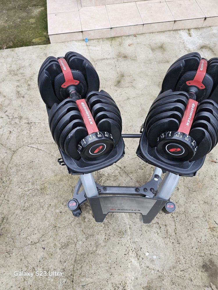 Great Condition Bowflex Dumbells 5-52 With Stand Easy to use adjusted from 5lbs to 52.5lbs each Cash only $370