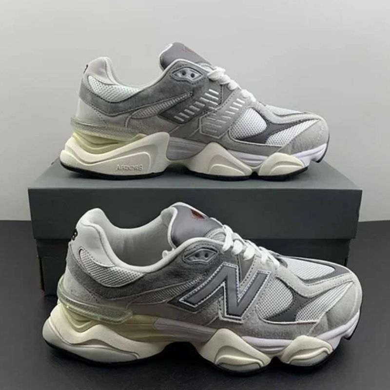 "New Balance 9060 Quartz Grey Size EU 39.5 The upper combines off-white mesh with soft pigskin suede overlays in a subtle grey hue. Branding elements include an NB 9060 badge atop the tongue, inspired by the original 991 lace jewel, and an embroidered Flying NB logo on the cream-colored leather back tab."