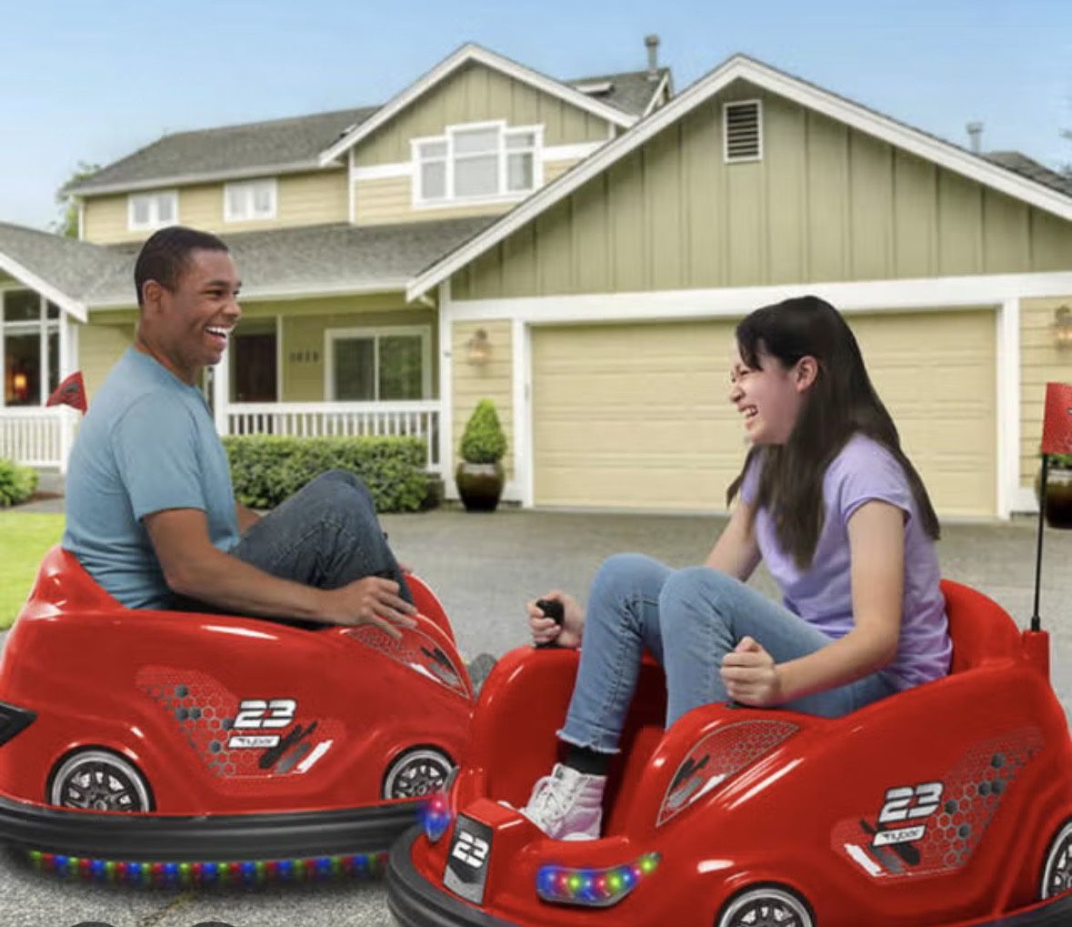 12V Battery Powered XL Bumper Car – perfect for boys, girls, kids, teens, and adults. This electric two-seater ride-on has a 12V rechargeable battery (charger included) and holds up to 175 lbs.
