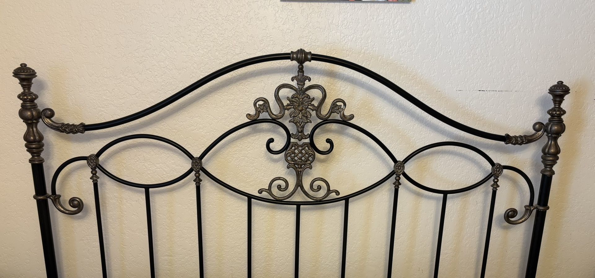 Scroll detailed wrought iron headboard. Queen size. Comes with free metal frame that can be attached, if you want it too!