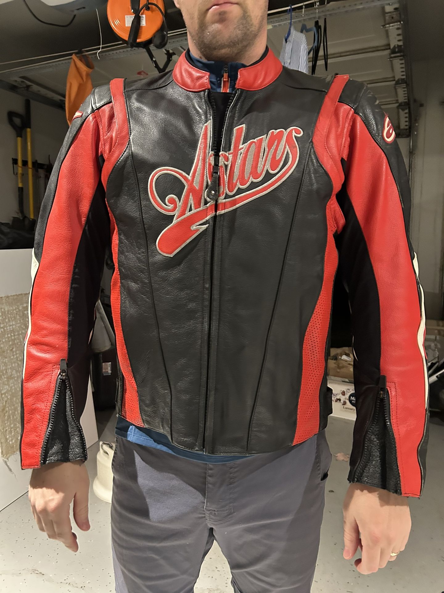 Retail: $600. Black Label Street Rider Jacket. Genuine leather riding jacket is in excellent condition with the exception of the few blemishes on the left shoulder. Outer Shell: •This jacket is made from 1.2-1.3 mm thick drum-dyed top grain cowhide leather for excellent abrasion resistance. •Pre-curved sleeves for the proper riding position. •Original YKK zipper at front, cuffs •Safety stitch. Inner Shell: •Racing leather jacket have 100% polyester mesh lining. •CE approved removable protectors on shoulder, elbow. •CE approved removable back protector & hump. •Safety stitched.had