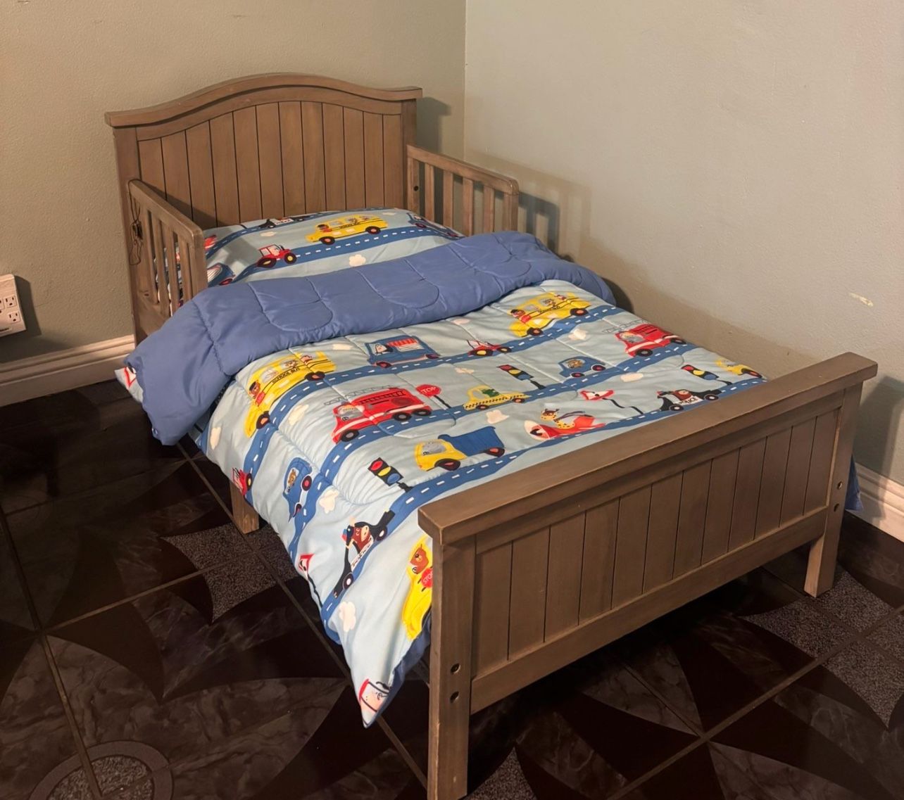 In really good conditions, gently use. Comes with mattress and bedding 4 ft 6 in x 3ft 7 in