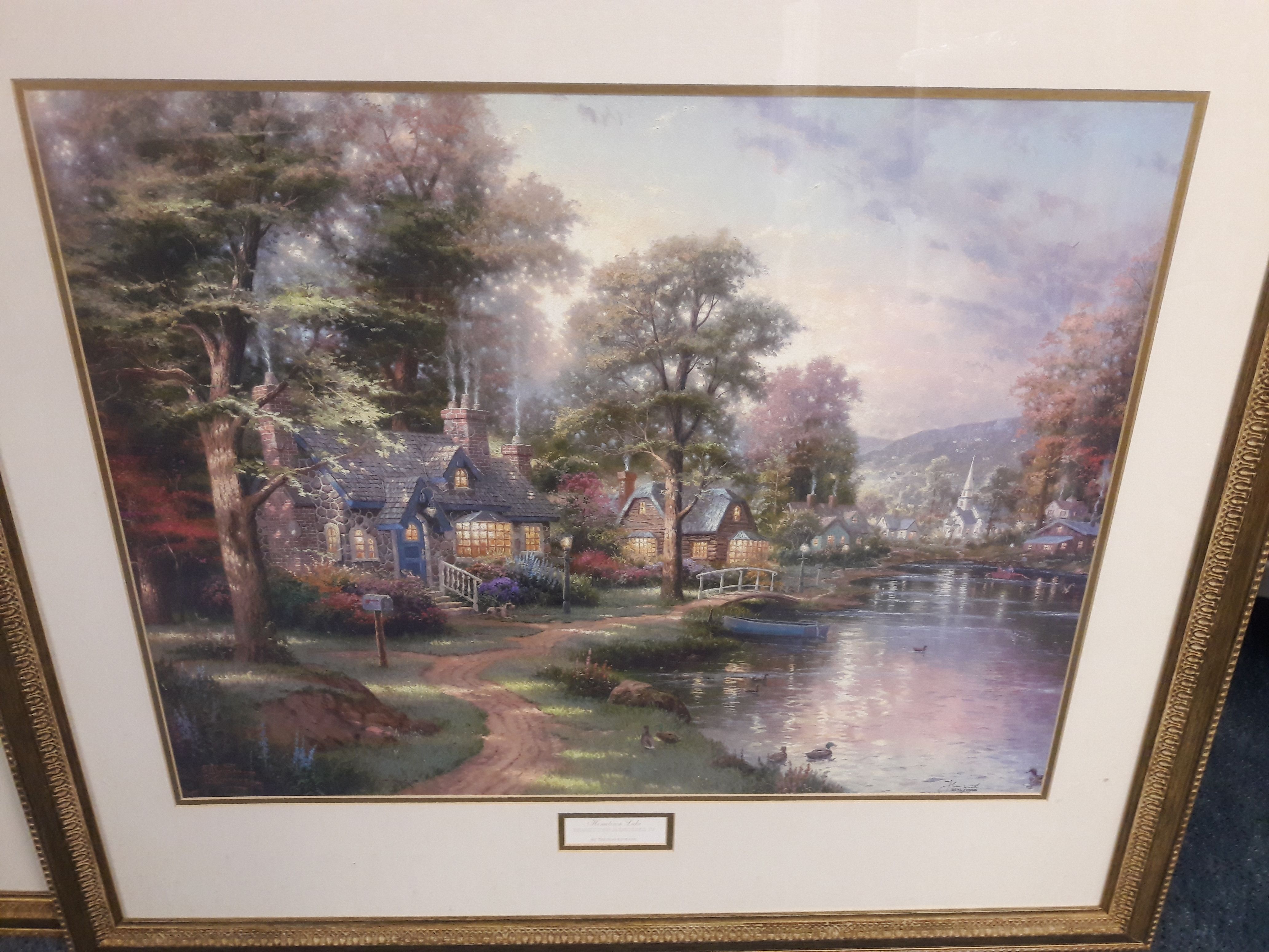 I am selling a Thomas Kinkade reproduction print. This is the Hometown Lake. I purchased this in 1996 when I opened my office. It cost over $300 back then. The frame alone would cost over $90.