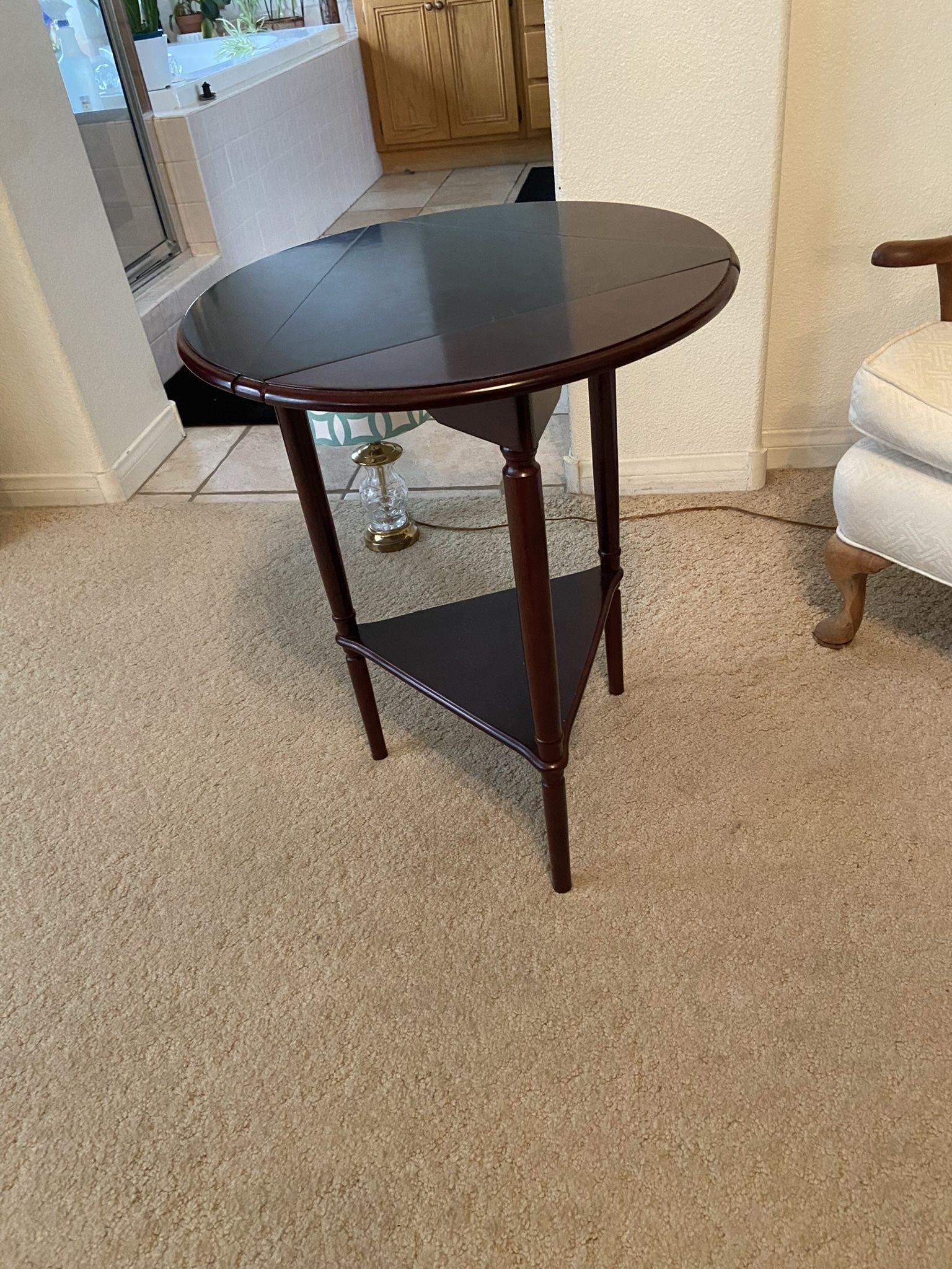 Fully extended is a round table with sides down is a triangular top
