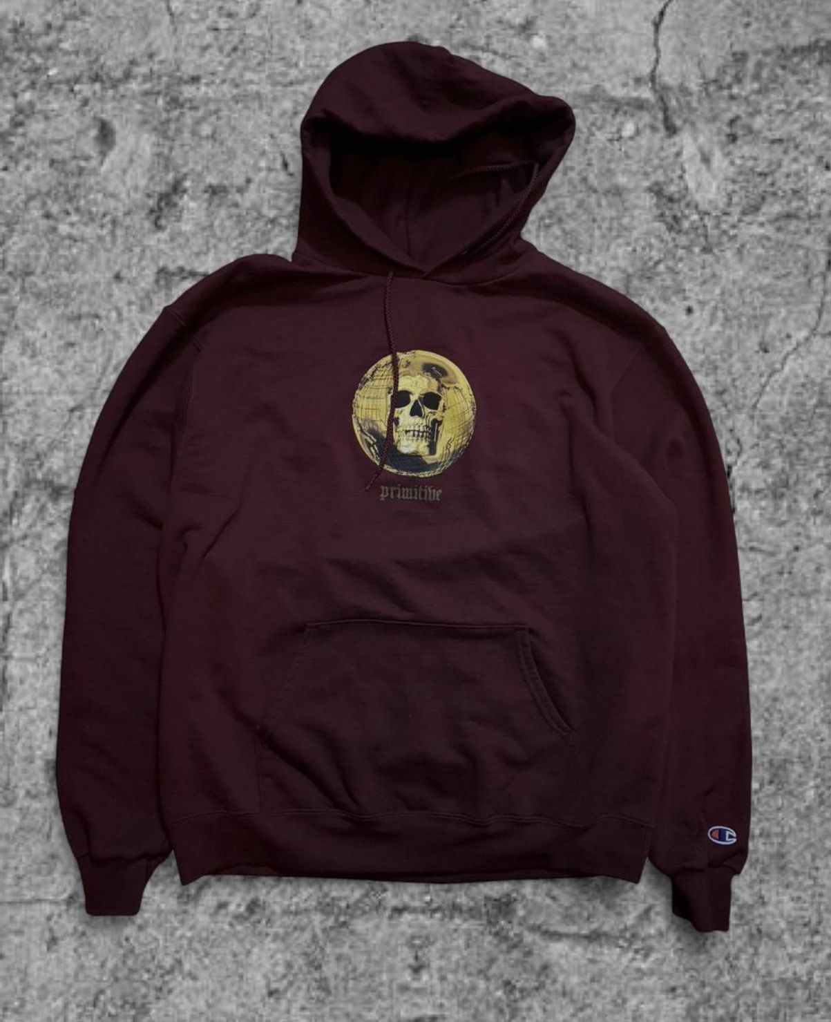 Burgundy Champion primitive hoodie with yellow skull graphic