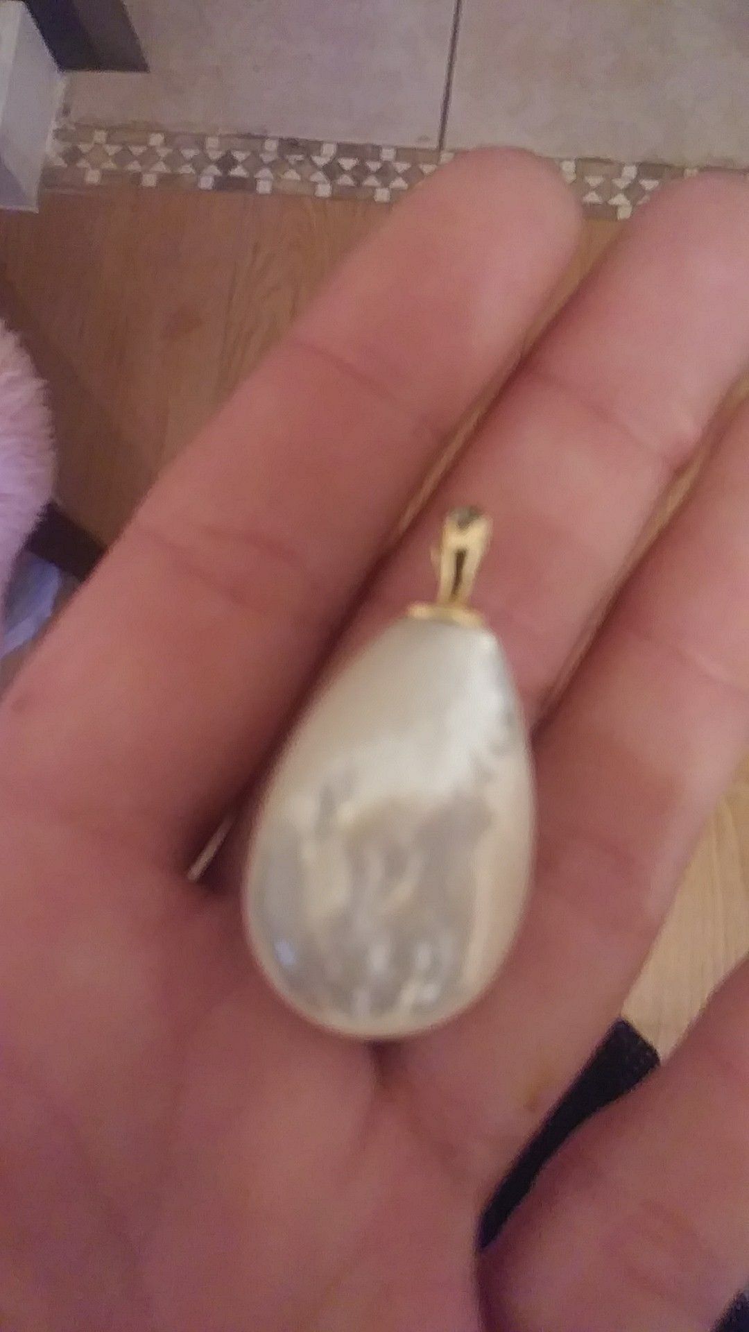 1.5" long mother of pearl pendant with great gold y clasp that easily attatches to anything from the front