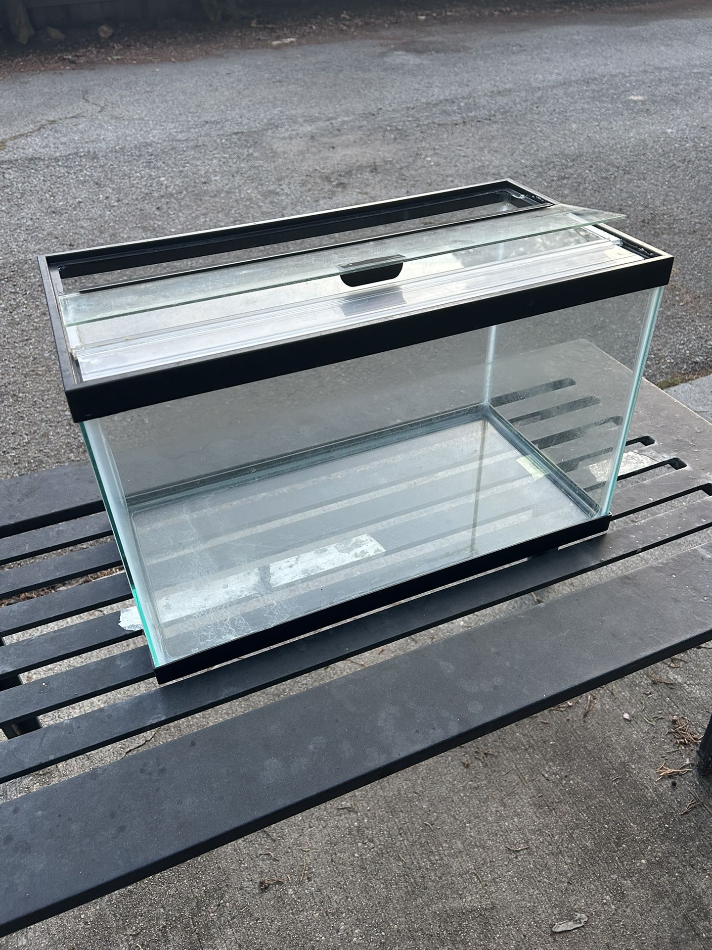 Small tank with lid. Probably ~10 gallons. Held my fish before he grew up :’) perfect for small fish or other pets