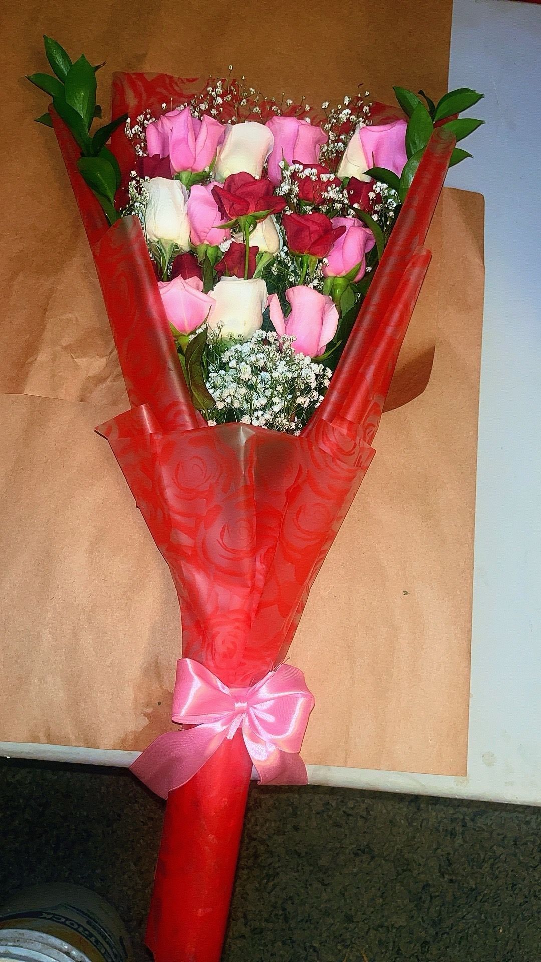 This beautiful flat rose bouquet features a lovely mix of pink and white roses accented with mini red roses. It is wrapped in elegant red wrapping paper and adorned with a bow. Personalized messages can be added upon request at no extra charge.