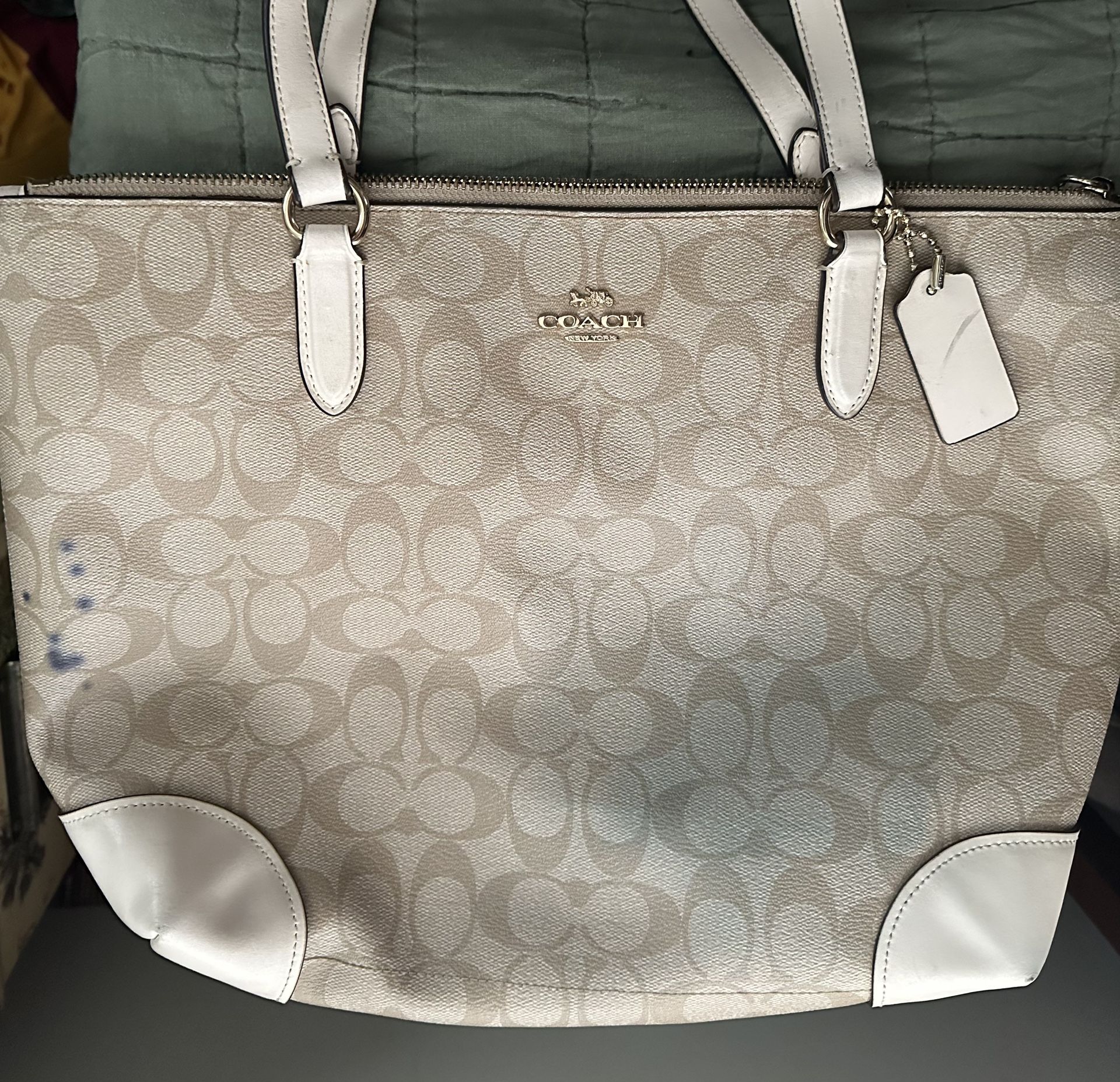Coach purse with ink damage and light wear. Inside is clean; stitching is intact; zipper function is good.